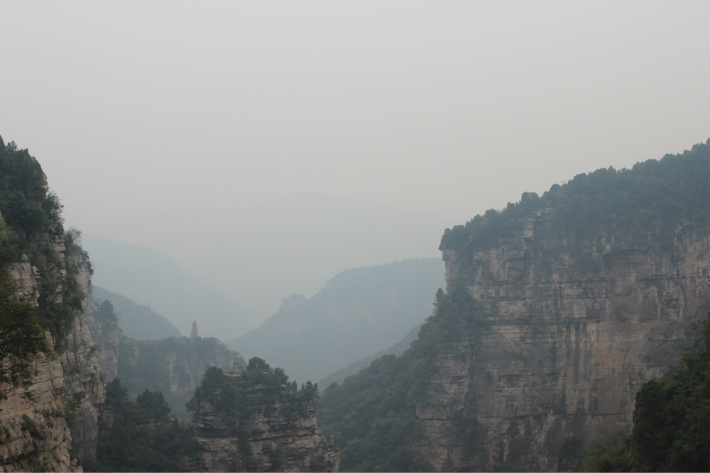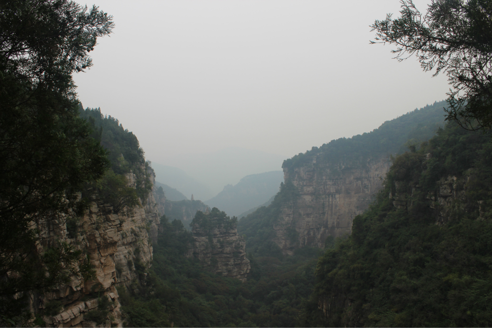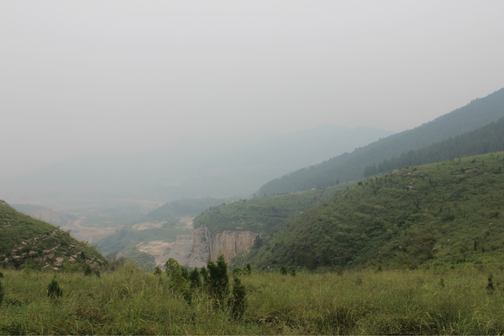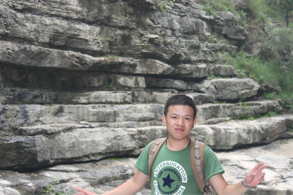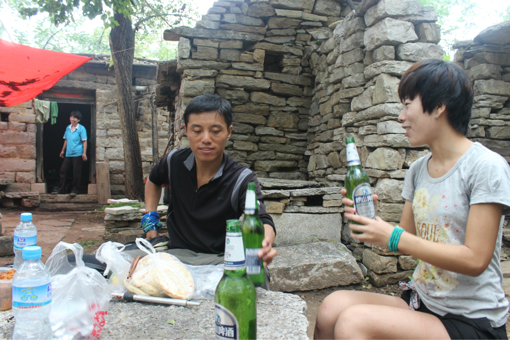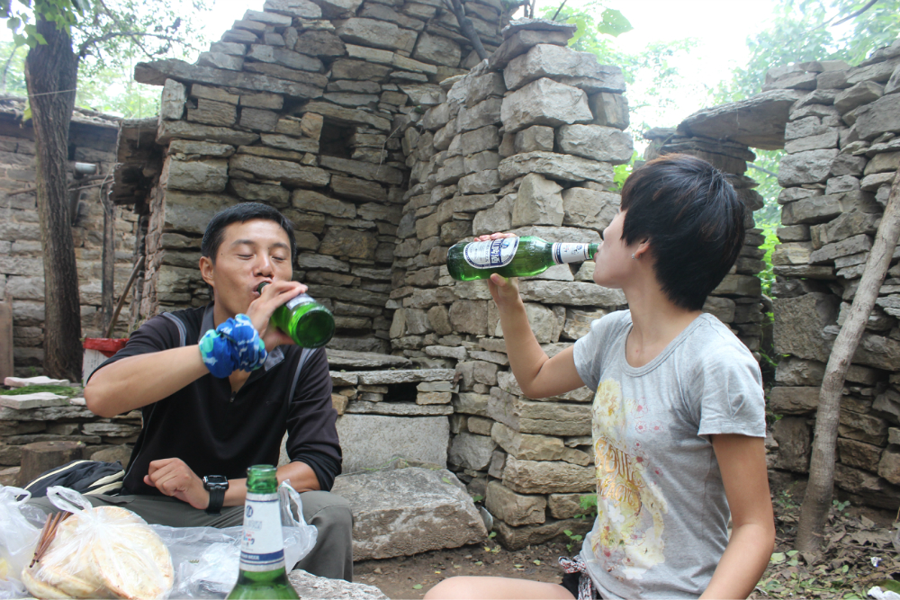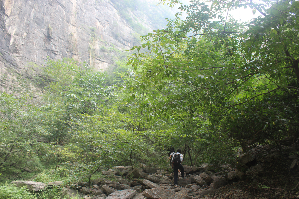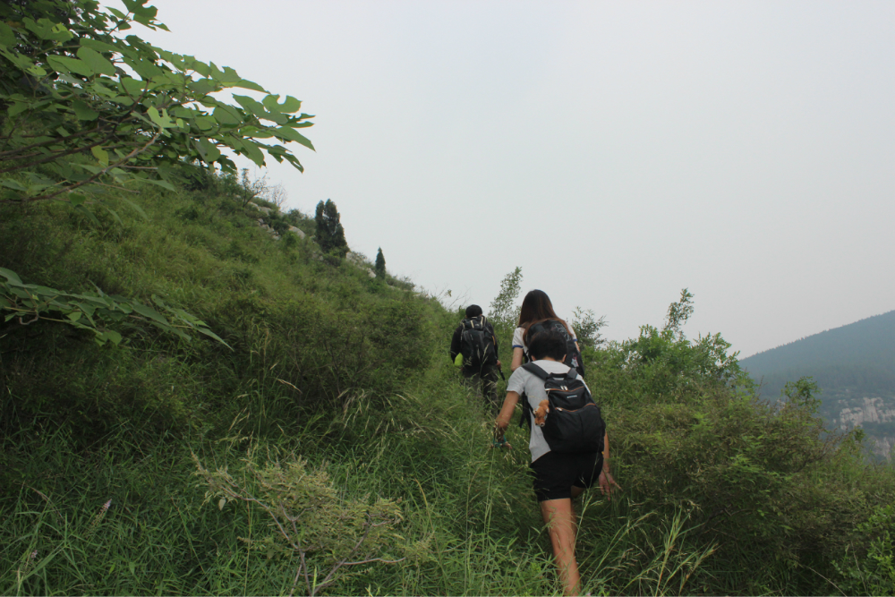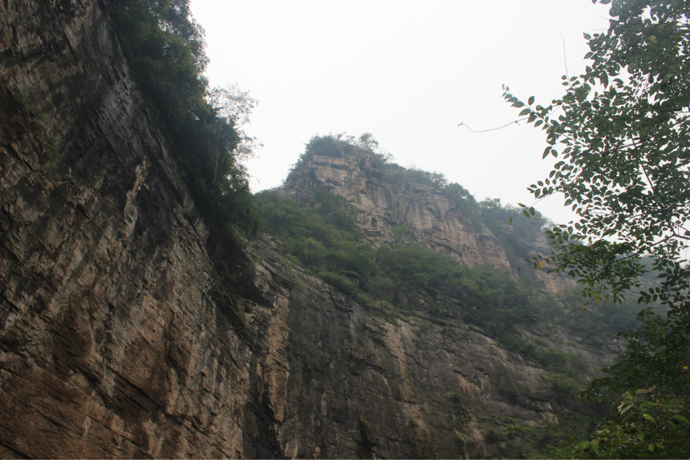 因为我的小佳在公司的抽屉里安睡,我拿着单反冒充了一下,路上有人误认为我是记者暗喜中,绕过繁华绕过尘土,乡间小路蜿蜒直上。一小时到达以第一个山顶,稍作休息来一个苹果酥脆酸甜是我喜欢的口感。虽然未见到阳光下的蓝天却也因为这远离尘嚣的安静而欣喜雀跃。简单休整继续前行,遥远对于藏龙涧的熟悉让我们经历了很多美景,那陡峭的石壁有着北方少见的壮观,那石壁上细微流淌的清水让这山有了灵性。可惜不是桑葚盛产的季节只能在遗憾之后等待来年....一线天,陡峭危险,举步维艰,但是从下向上仰望时却又满是成就感。BOBO笑我说在这样危险的境地还不忘拍照,这种喜爱值得去买一台单反。 在一个宽敞的地方用山涧的清水洗洗满手的污垢,坐着聊聊天。周围是美景,身边是好友,这样的周末是多么的难得,一路上都得到了遥远的照顾,我们三个人一致认为有遥远当领队是一件幸福的事情!碰上驴友简单的招呼一下尽管并不认识却因为共同的兴趣而亲切,路上捡到一个大哥跟随我们的队伍去了一路上广告不断的手擀面店,老板很淳朴热情,我们也跟着遥远沾光得到一大碗珍贵的面汤,珍贵的原因不是因为贵而是因为需要人工挑上山的水所以值得珍惜。我对于面的热衷度取决于厨师的手艺,看着一大碗的面条时有点犹豫怕被浪费然而说说笑笑中已经见底,菜菜跟两位帅哥还对饮一瓶,我在旁边以水代酒聊表敬意。