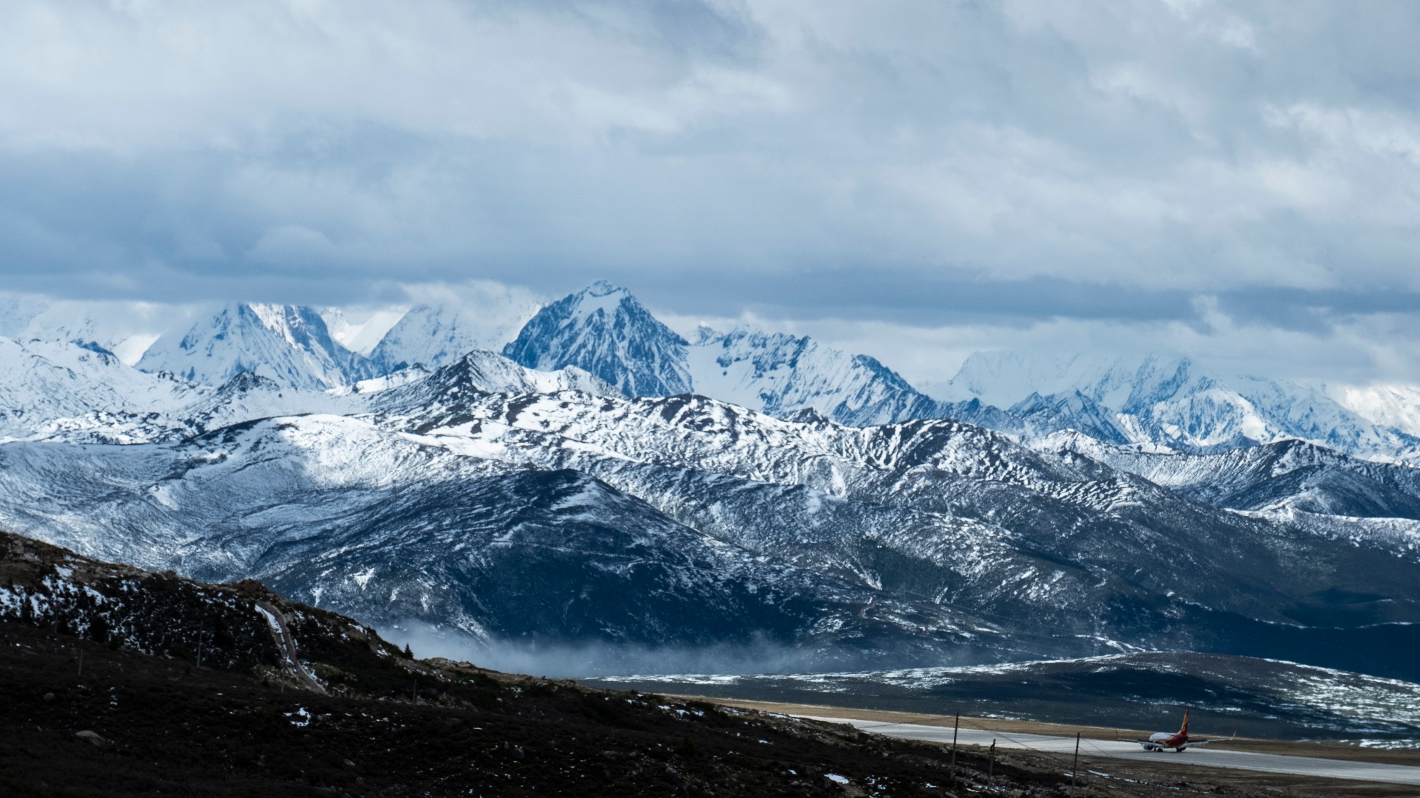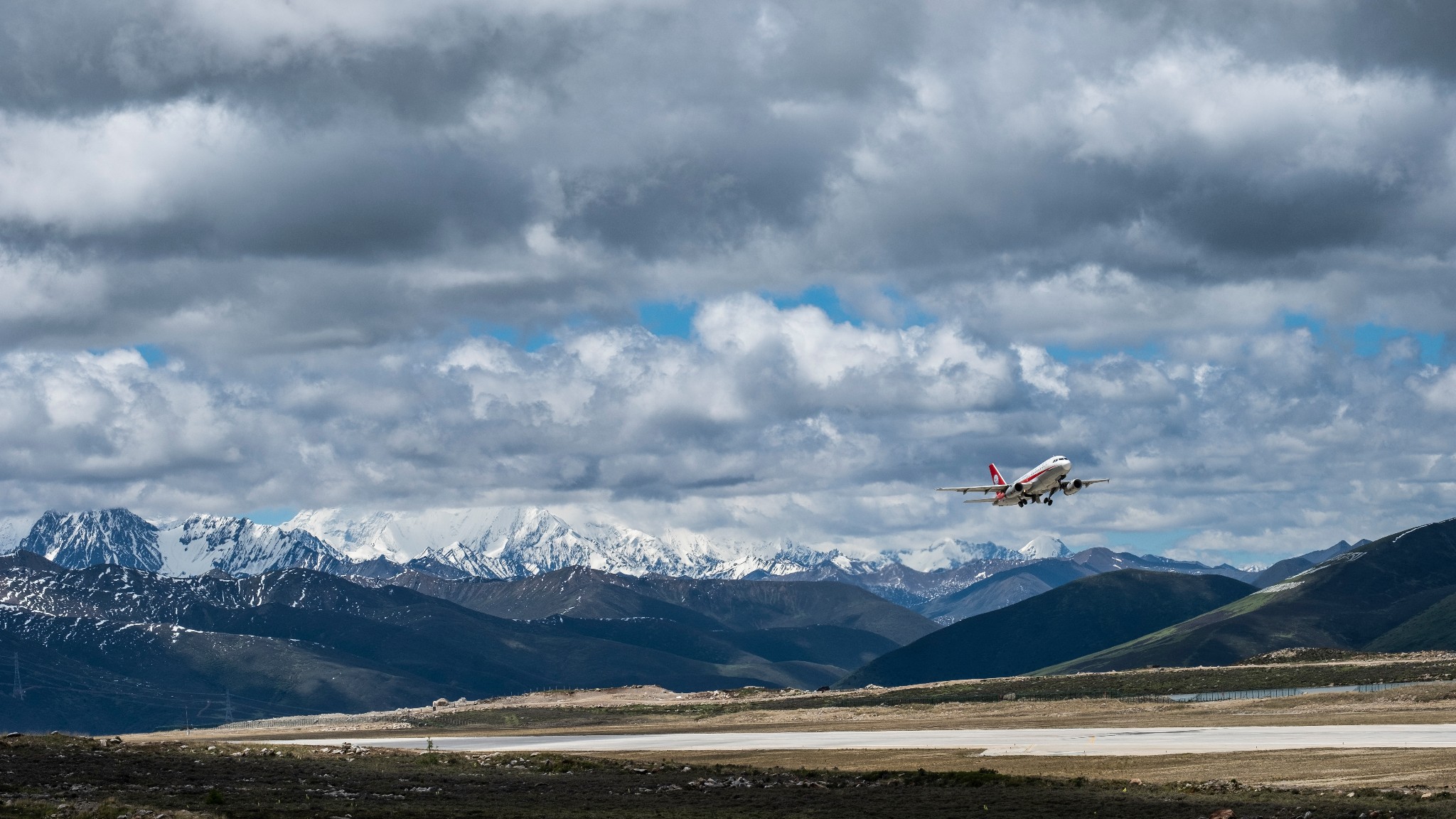 再次拍到机场的飞机起飞,背景就是大雪山山脉的贡嘎群山。