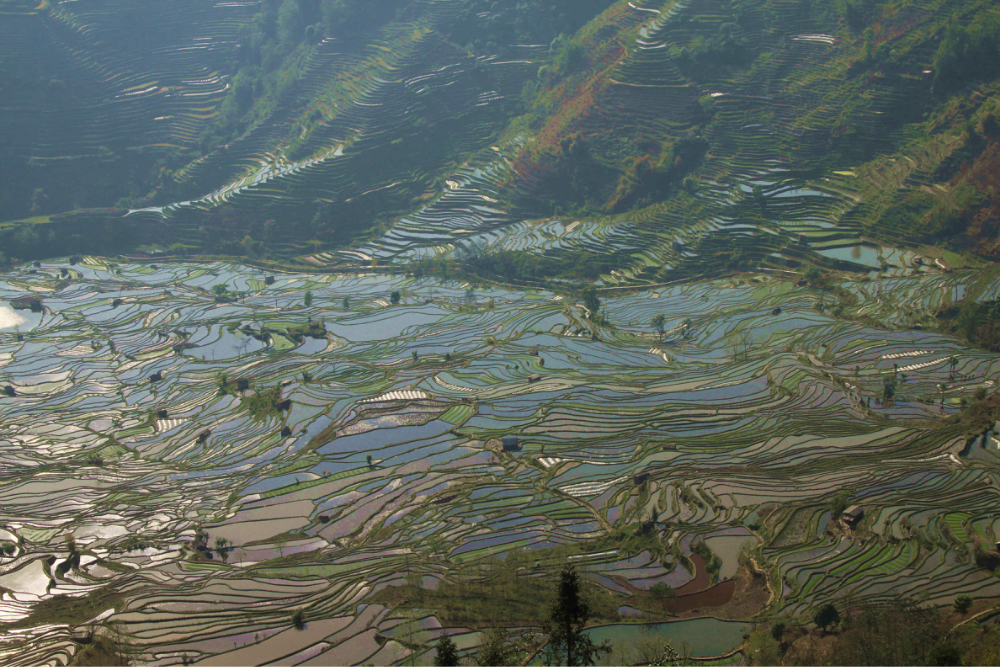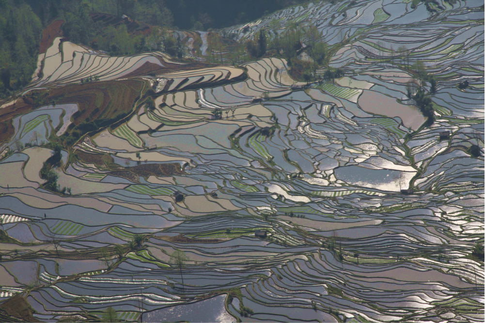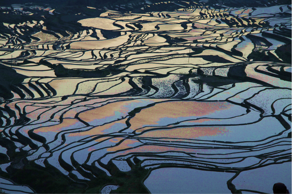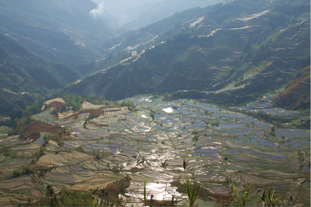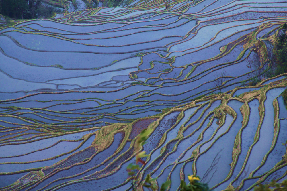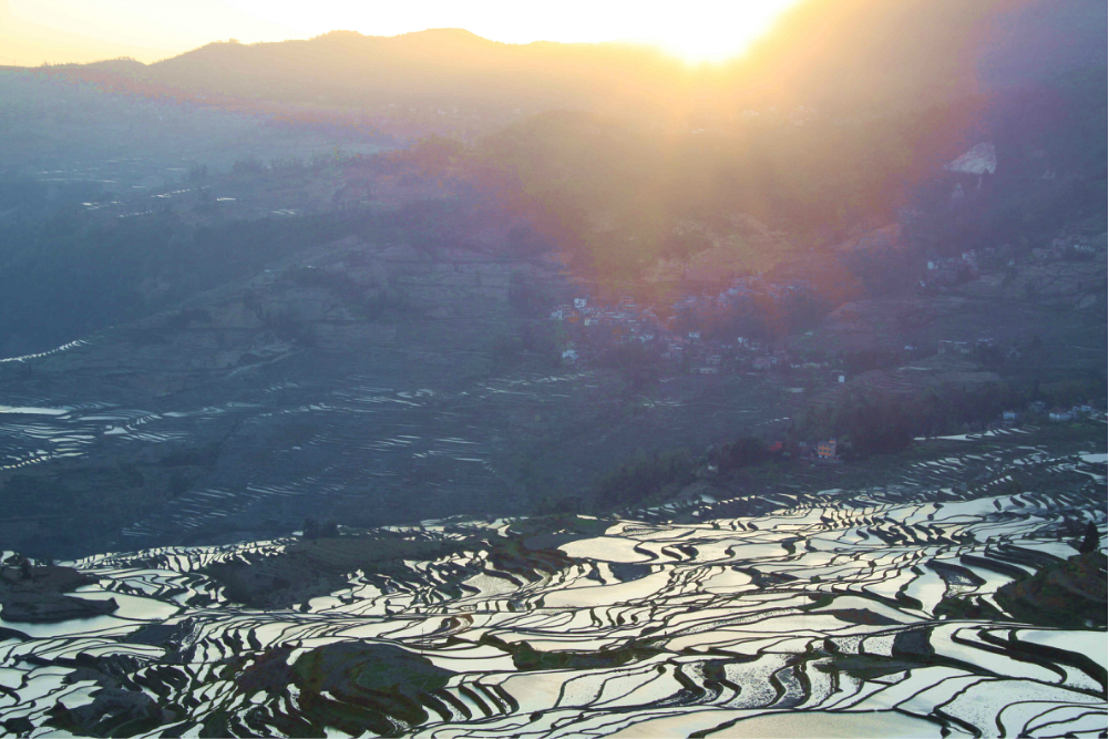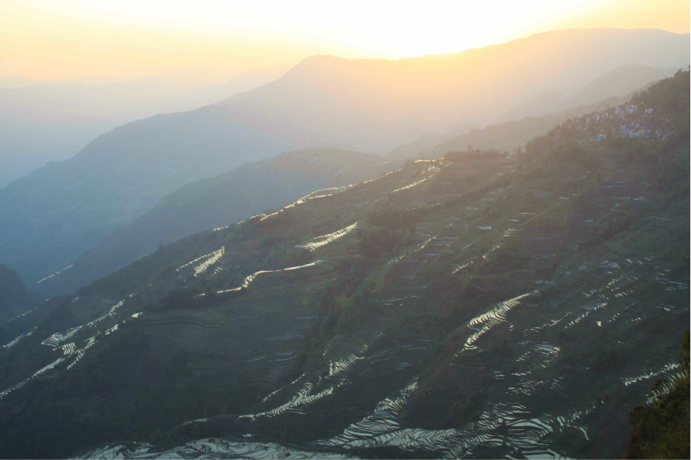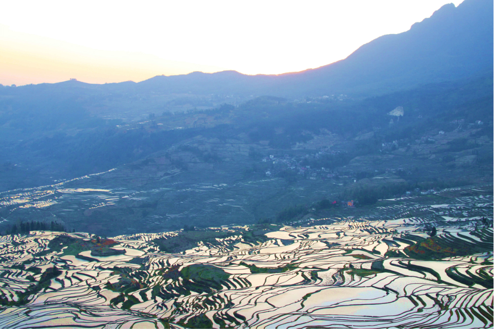 40分钟后,到坝达景区。沿不宽的山间小路进去一千米左右,层层叠叠的梯田就呈现在眼前。从山脚到山顶,足有上千级,从近处到天际,不下数万亩。哈尼族人民的惊世杰作,令人叹为天作。