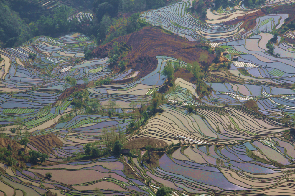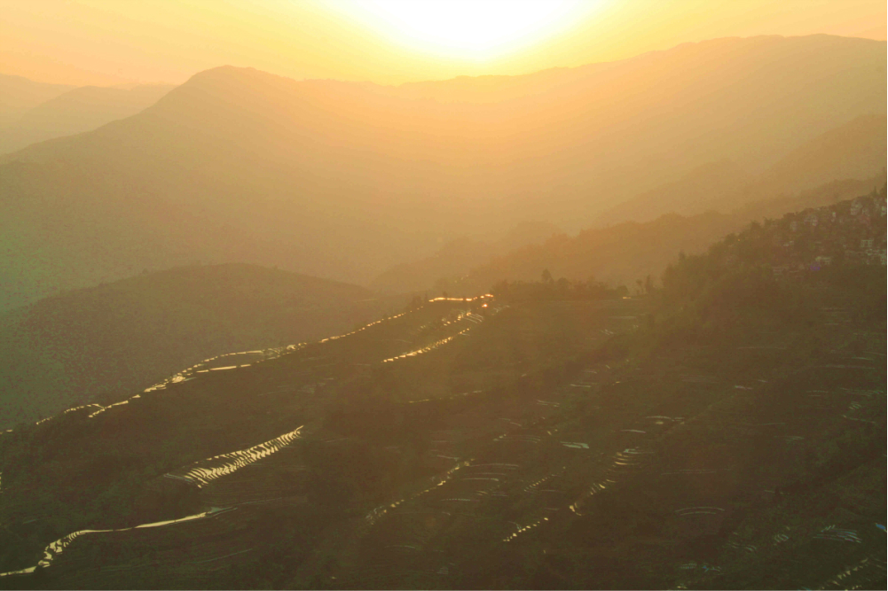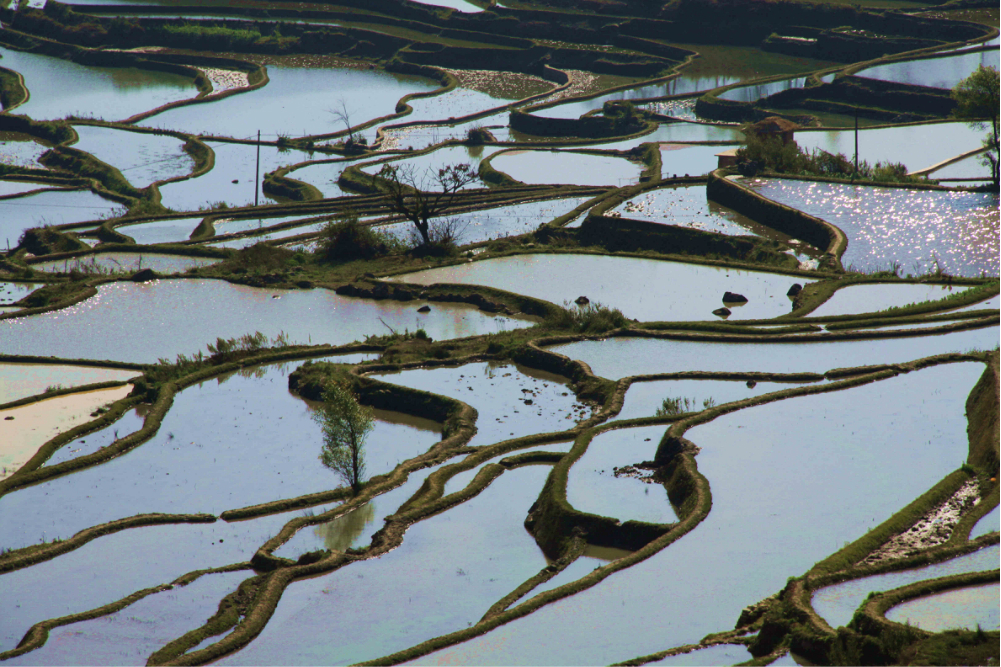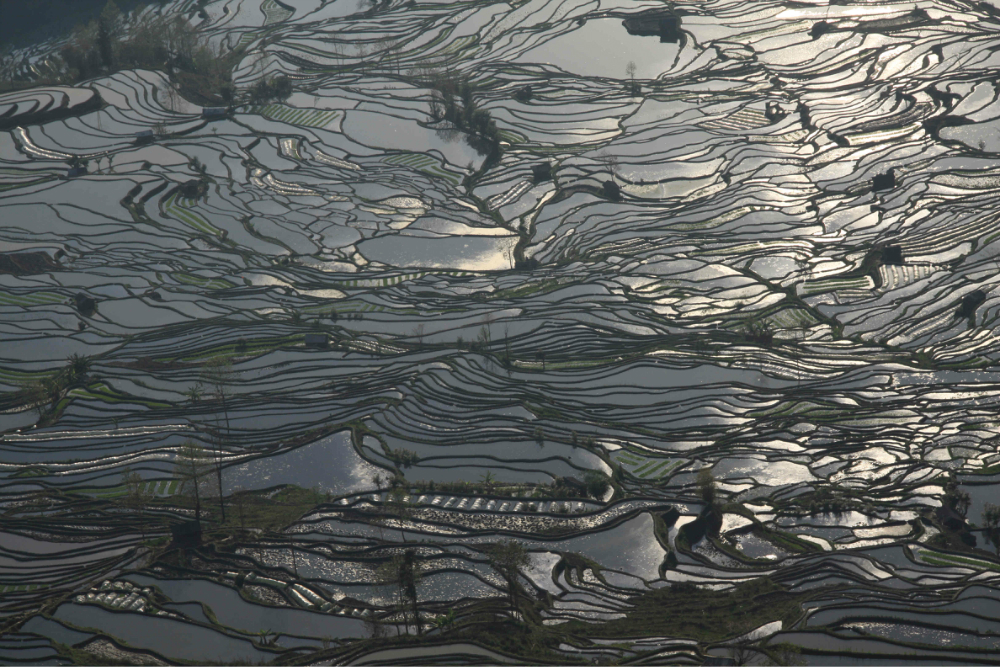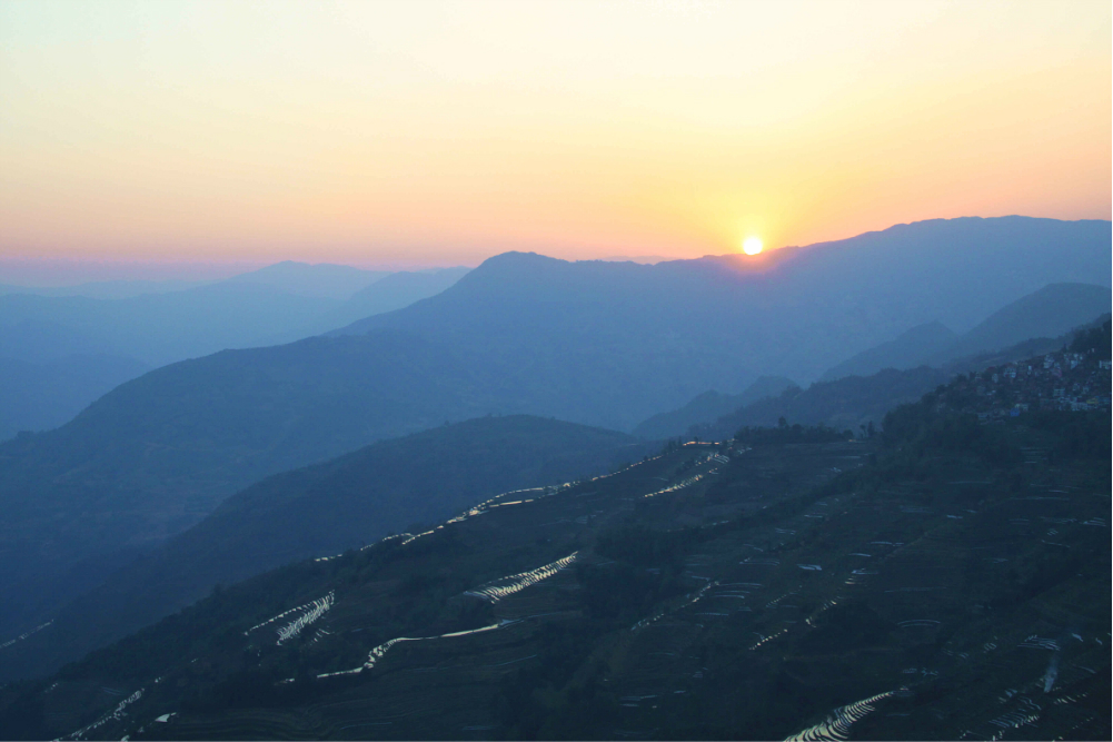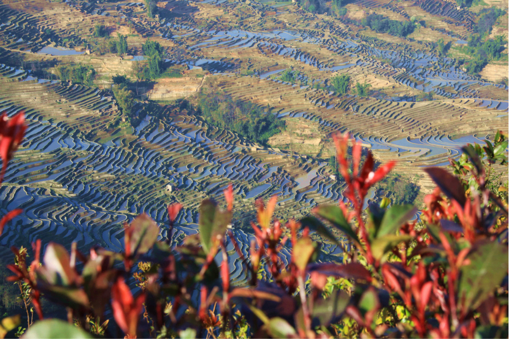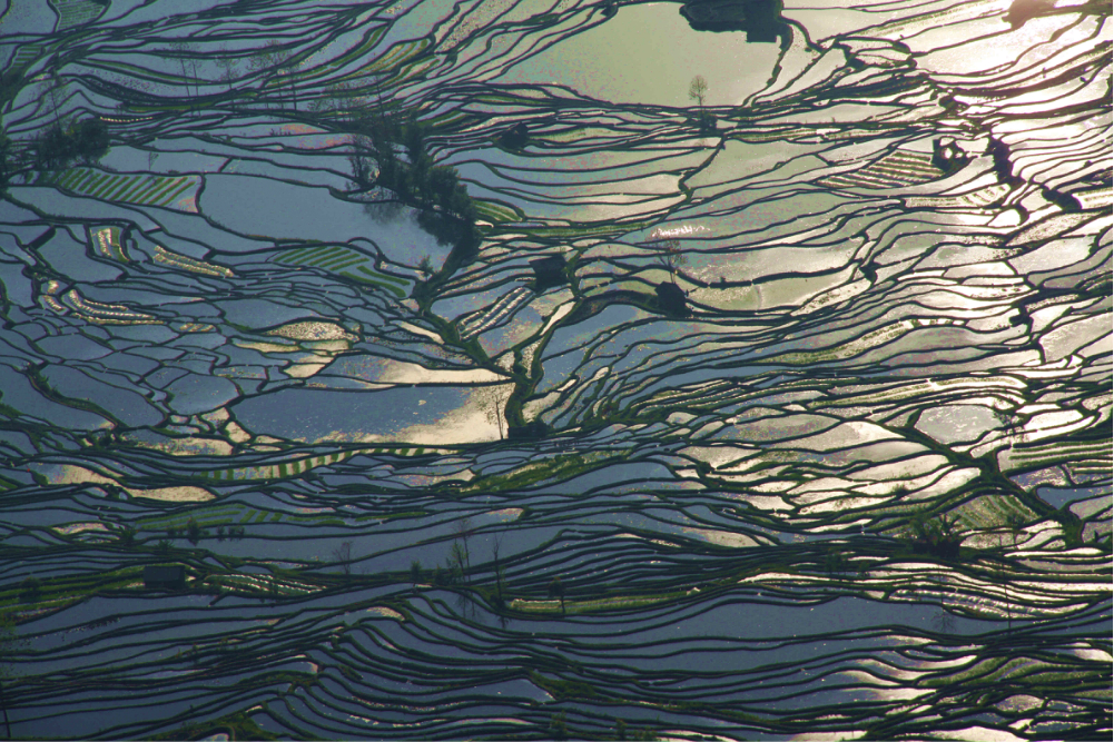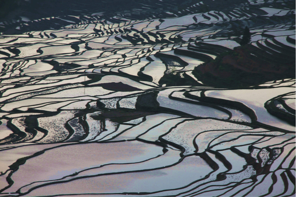 40分钟后,到坝达景区。沿不宽的山间小路进去一千米左右,层层叠叠的梯田就呈现在眼前。从山脚到山顶,足有上千级,从近处到天际,不下数万亩。哈尼族人民的惊世杰作,令人叹为天作。