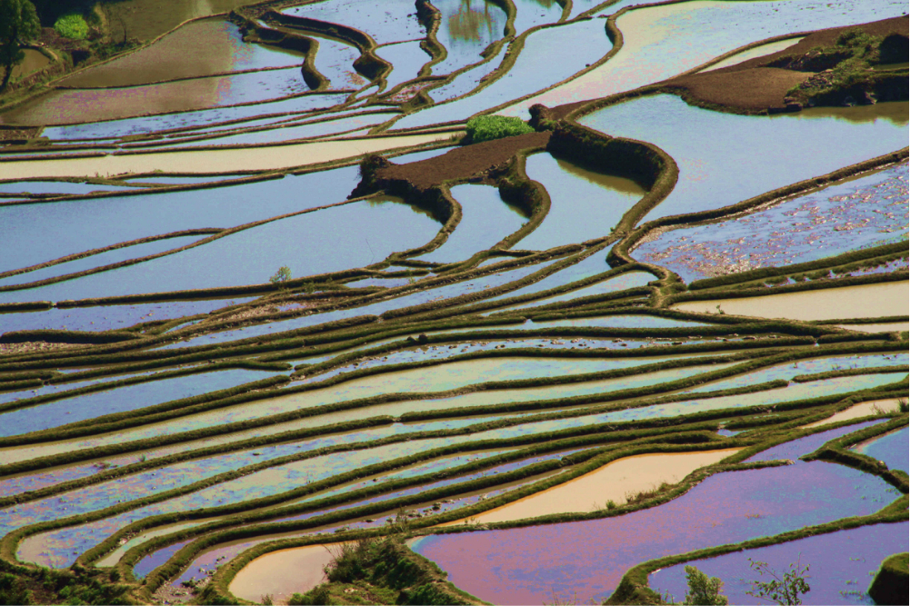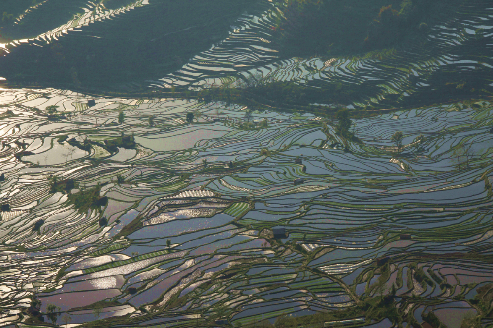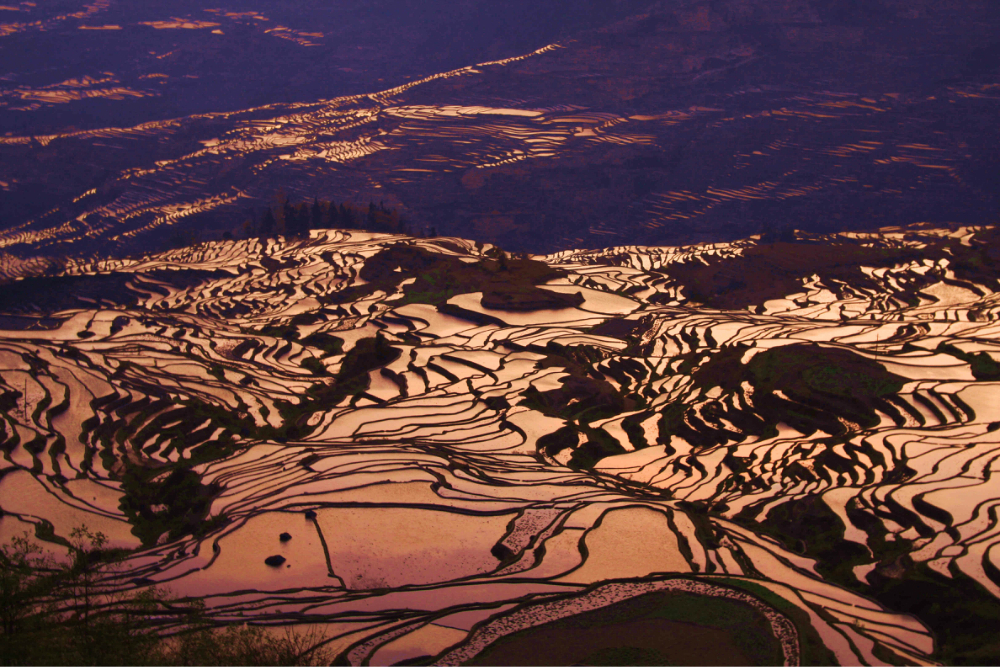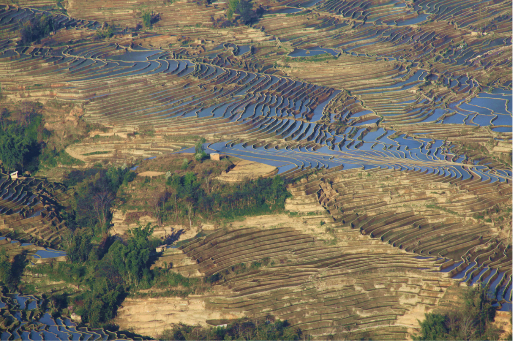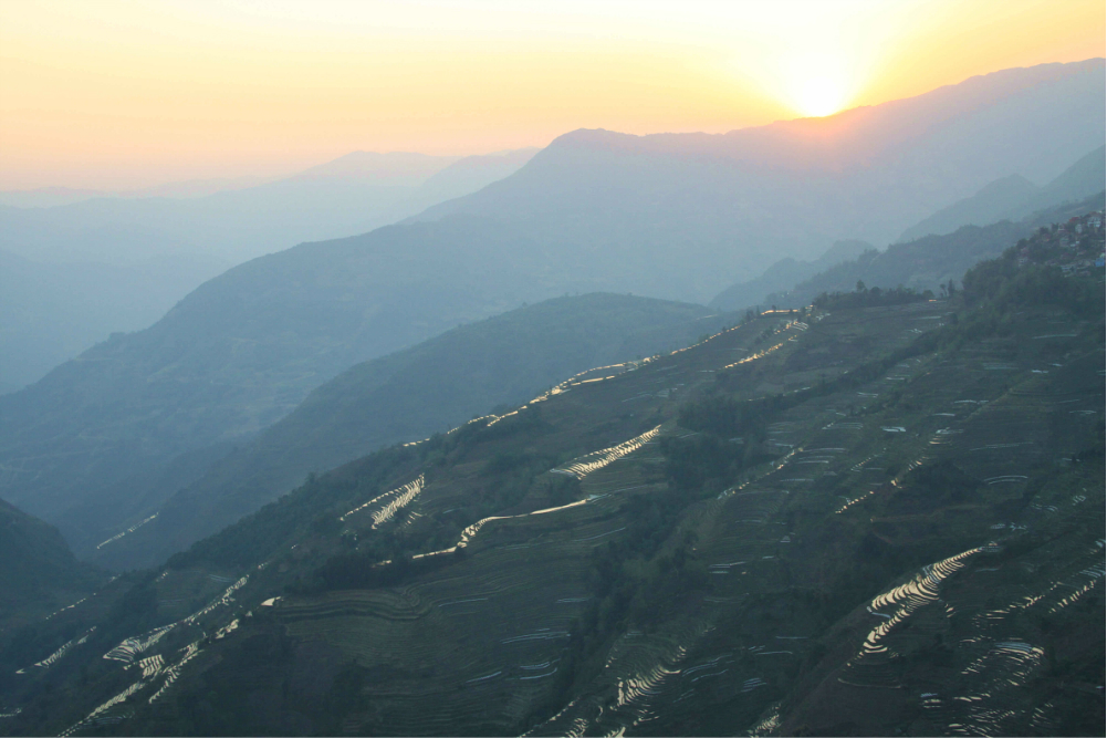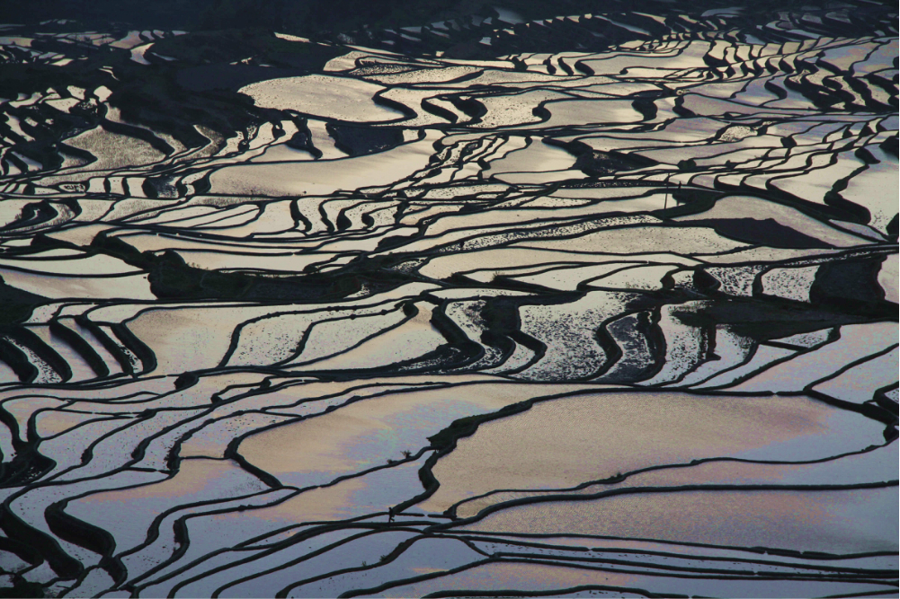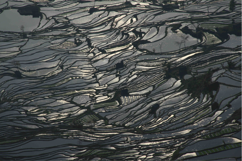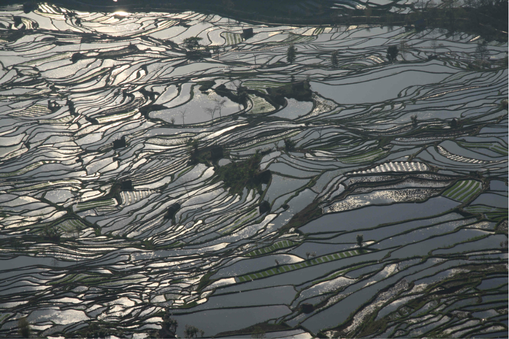 40分钟后,到坝达景区。沿不宽的山间小路进去一千米左右,层层叠叠的梯田就呈现在眼前。从山脚到山顶,足有上千级,从近处到天际,不下数万亩。哈尼族人民的惊世杰作,令人叹为天作。