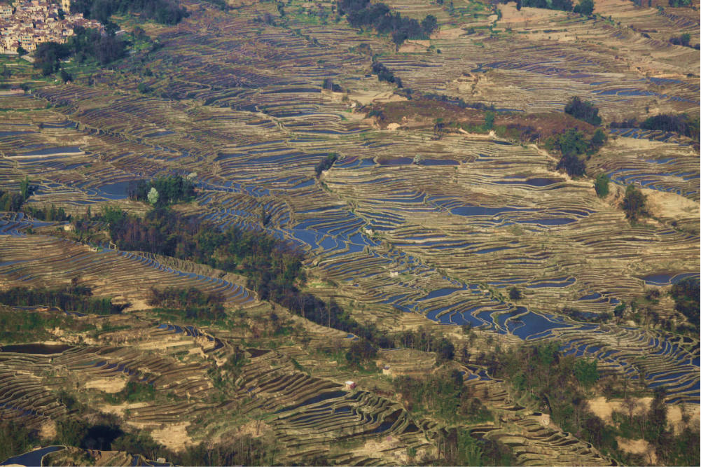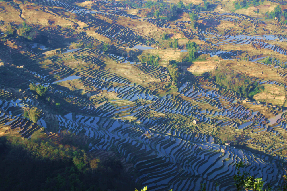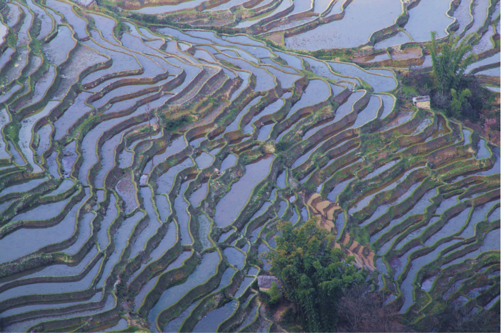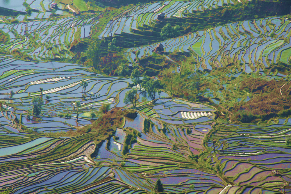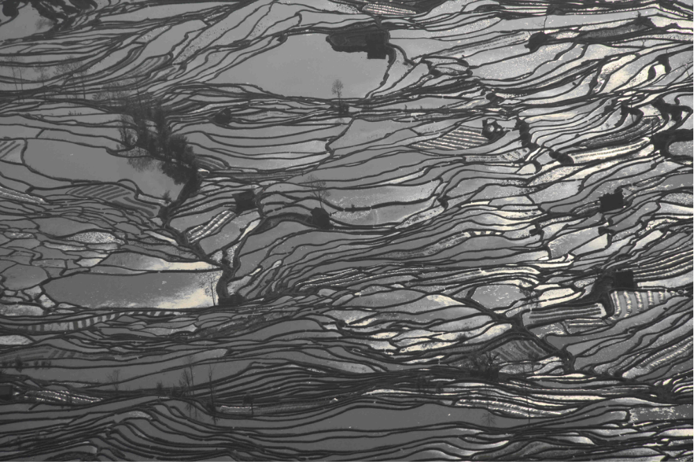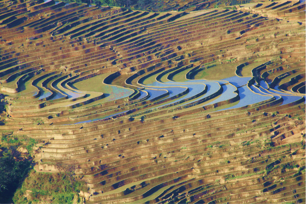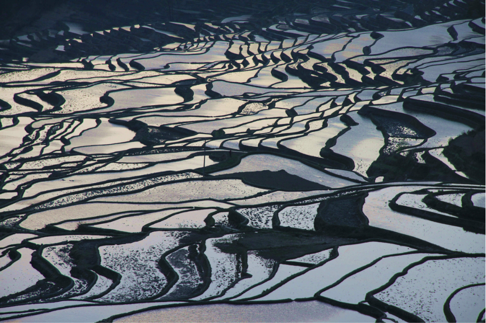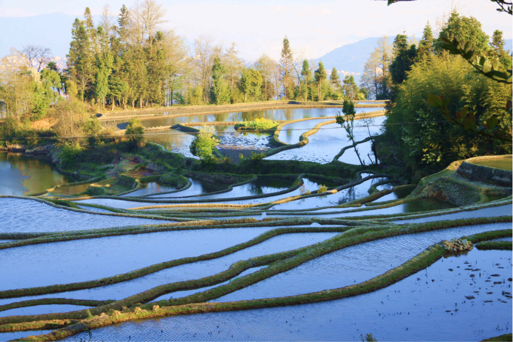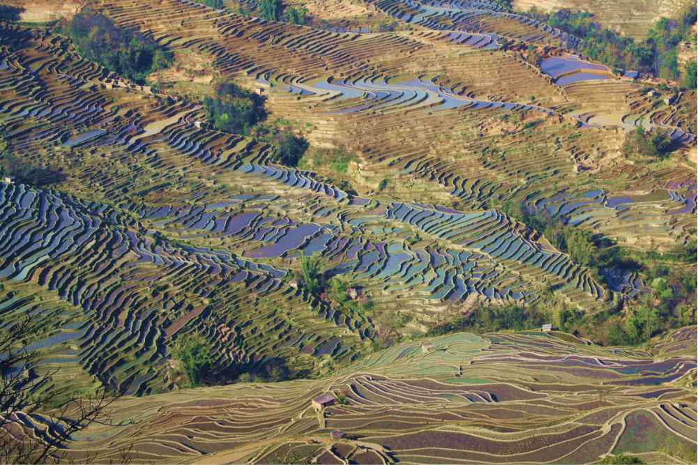 40分钟后,到坝达景区。沿不宽的山间小路进去一千米左右,层层叠叠的梯田就呈现在眼前。从山脚到山顶,足有上千级,从近处到天际,不下数万亩。哈尼族人民的惊世杰作,令人叹为天作。