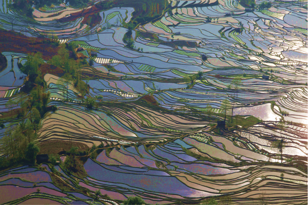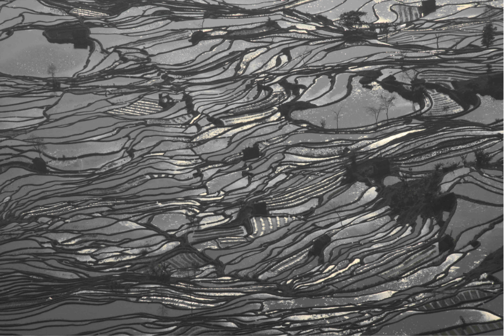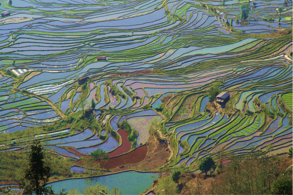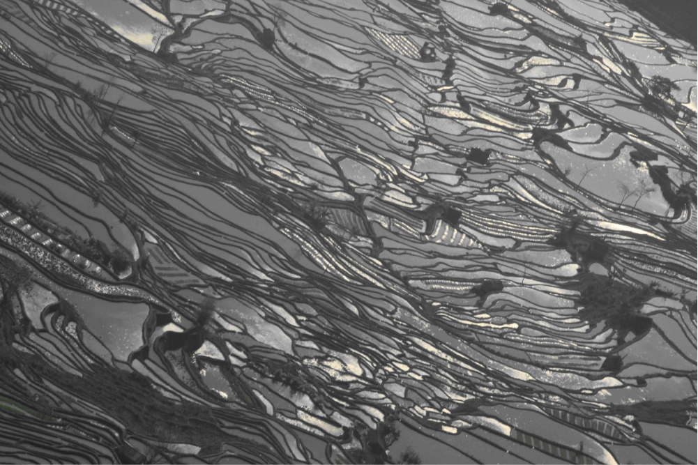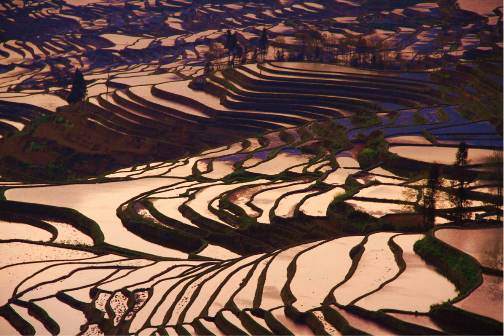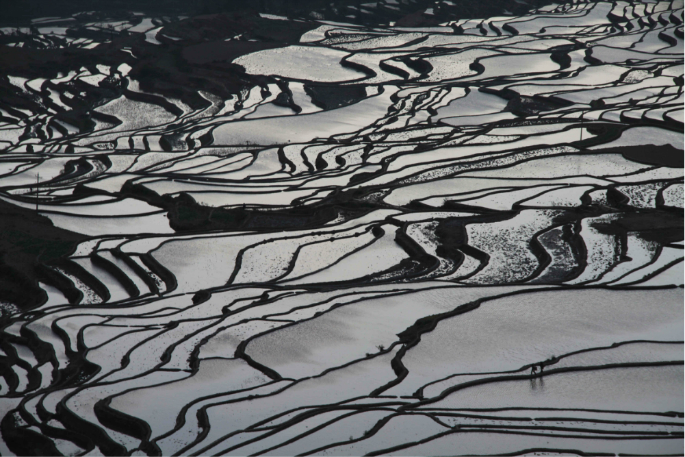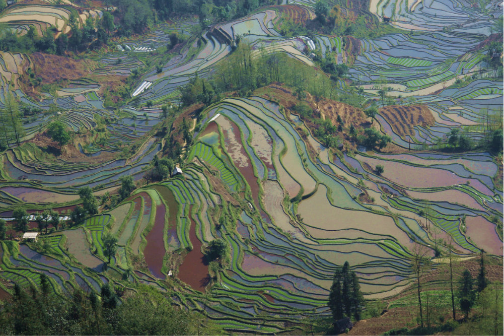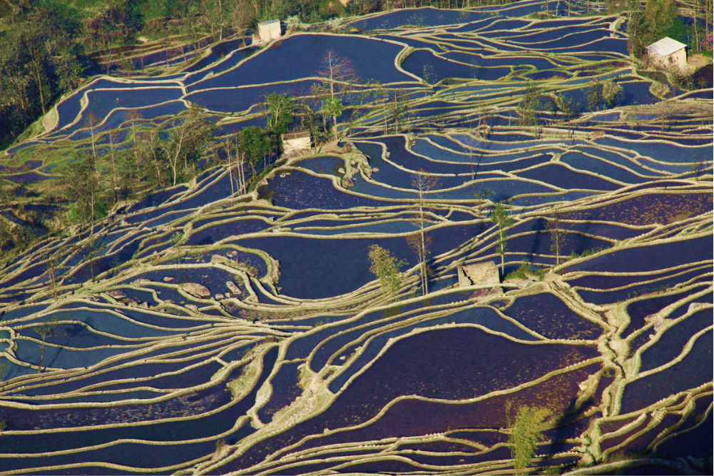 40分钟后,到坝达景区。沿不宽的山间小路进去一千米左右,层层叠叠的梯田就呈现在眼前。从山脚到山顶,足有上千级,从近处到天际,不下数万亩。哈尼族人民的惊世杰作,令人叹为天作。