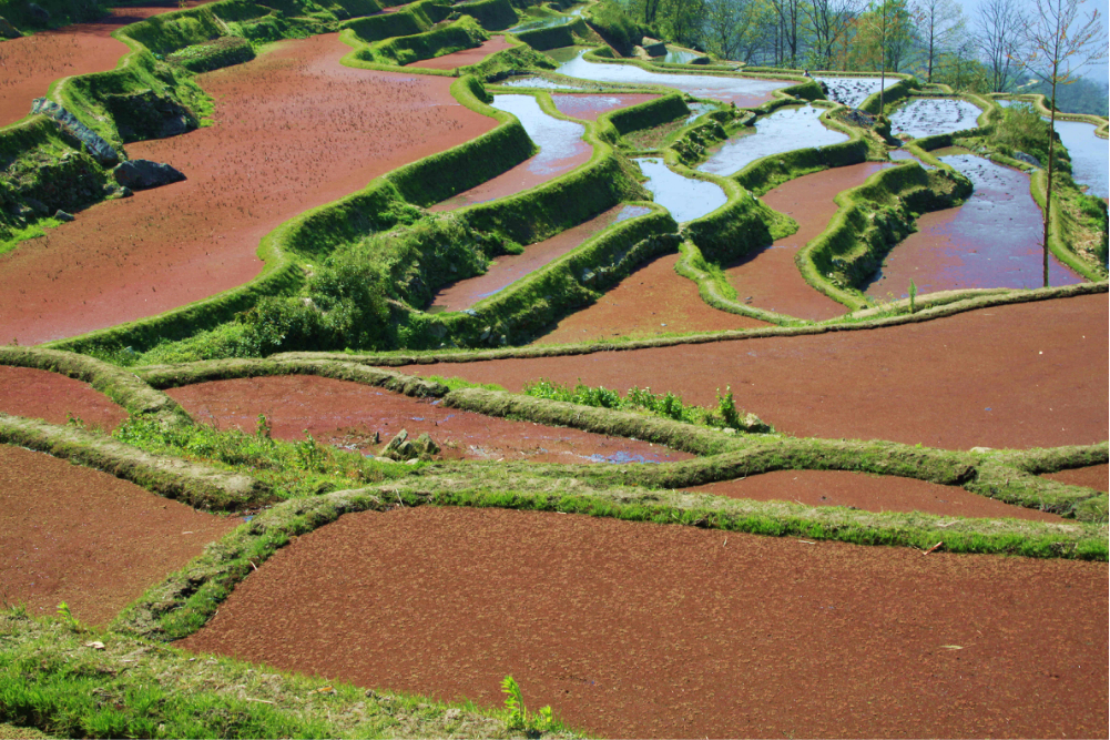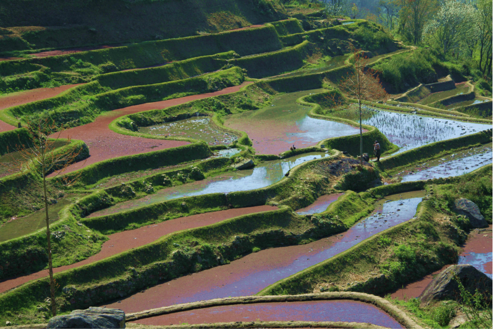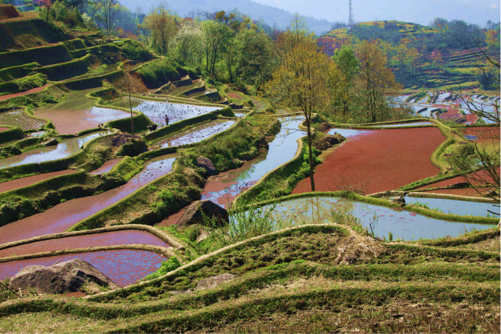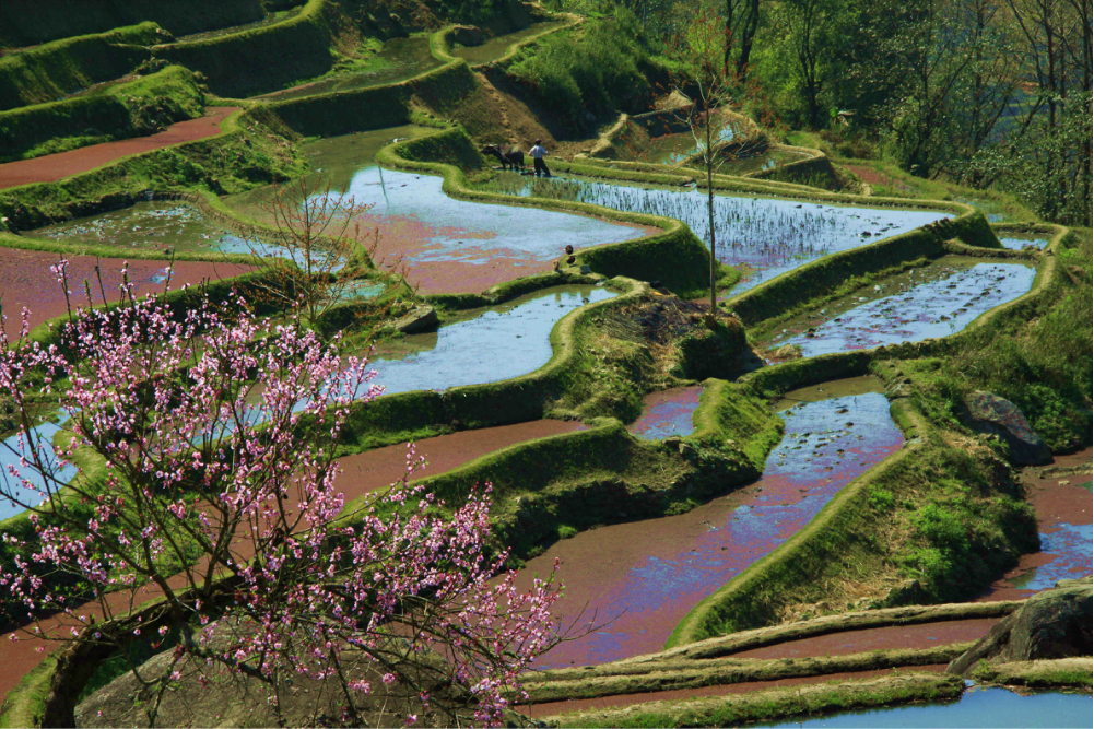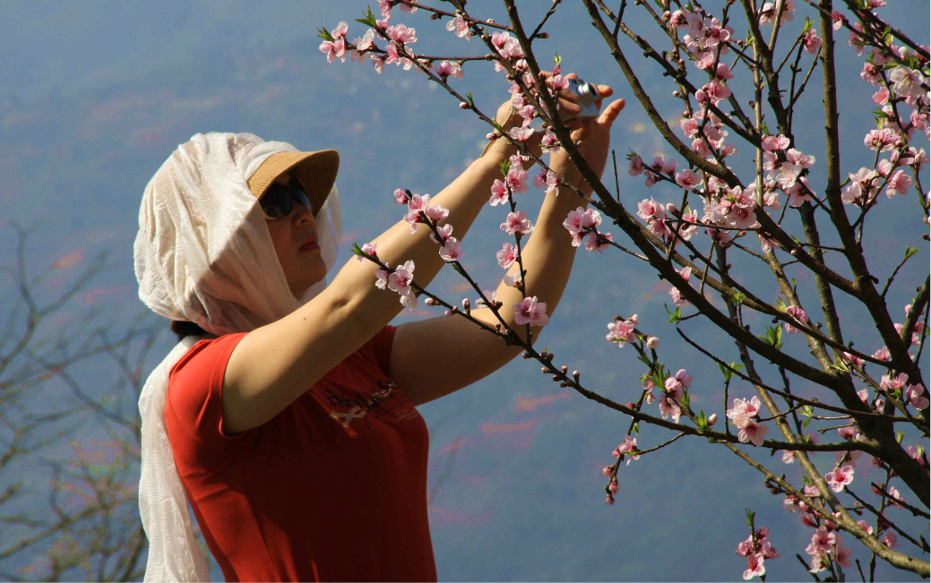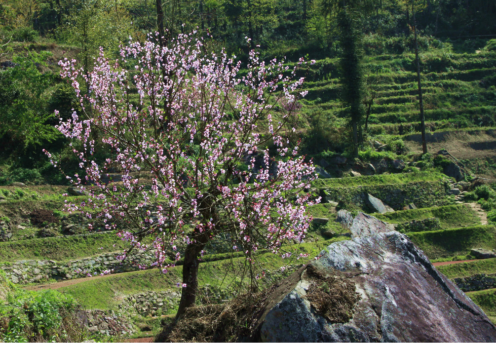 下午2:00,再出发,到龙树坝。这里的水田中,多了一些彩色的浮萍。艳丽的梯田,好早开的桃花,留影的游人,躬耕的老农,好一幅躬耕春游图。