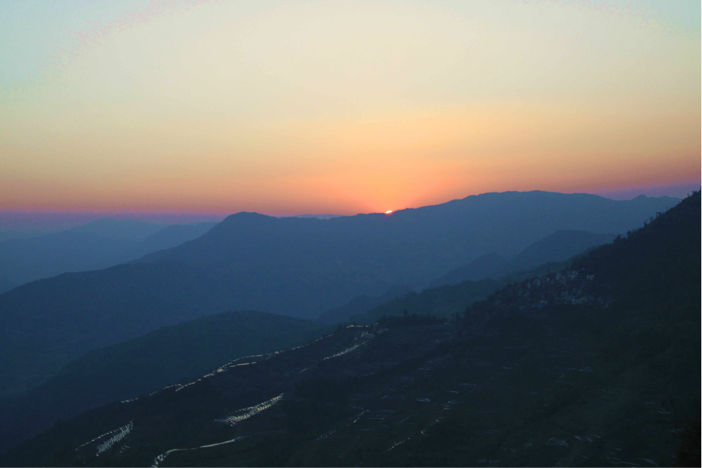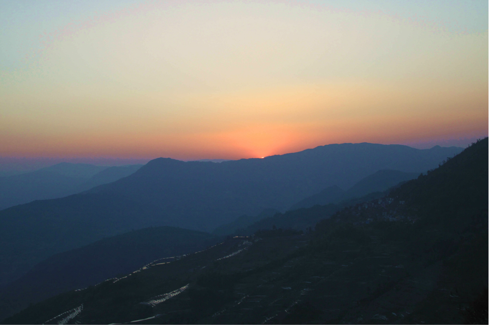 到了多依树,天还没亮,景区外已经停了几百辆车。观景台栏杆边,挤满了等待日出的人们。来回走了几趟,总算找到缝隙,挤了进去。不久,东方开始泛红,“咔嚓,咔嚓”,摄友们急急忙忙将这良辰美景摄入镜中。