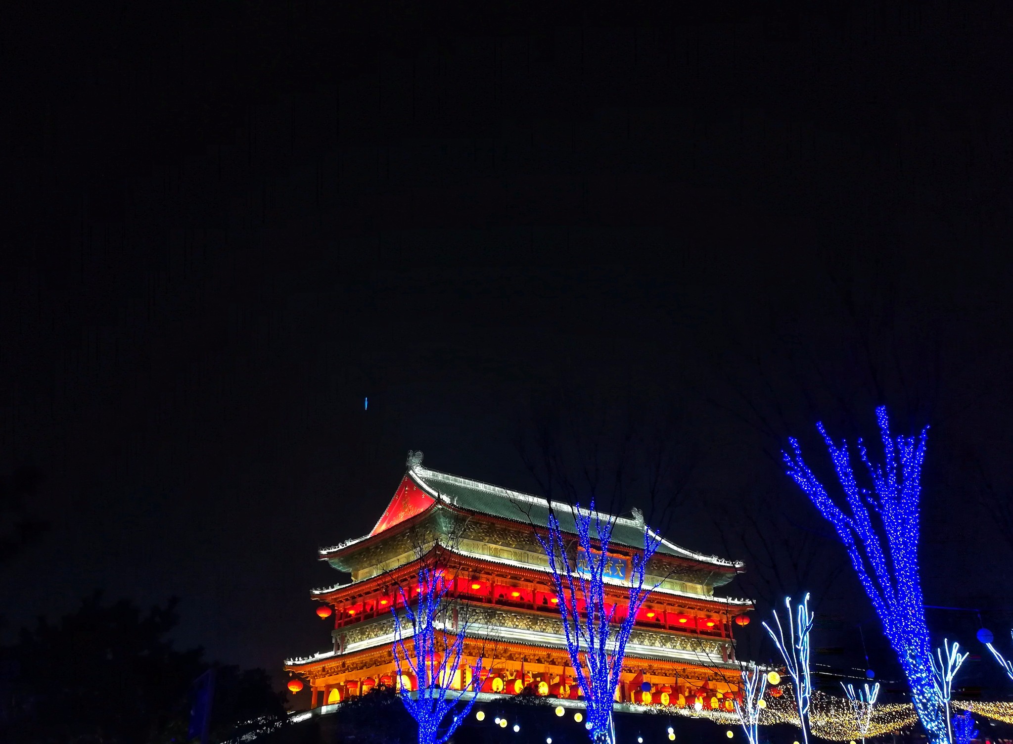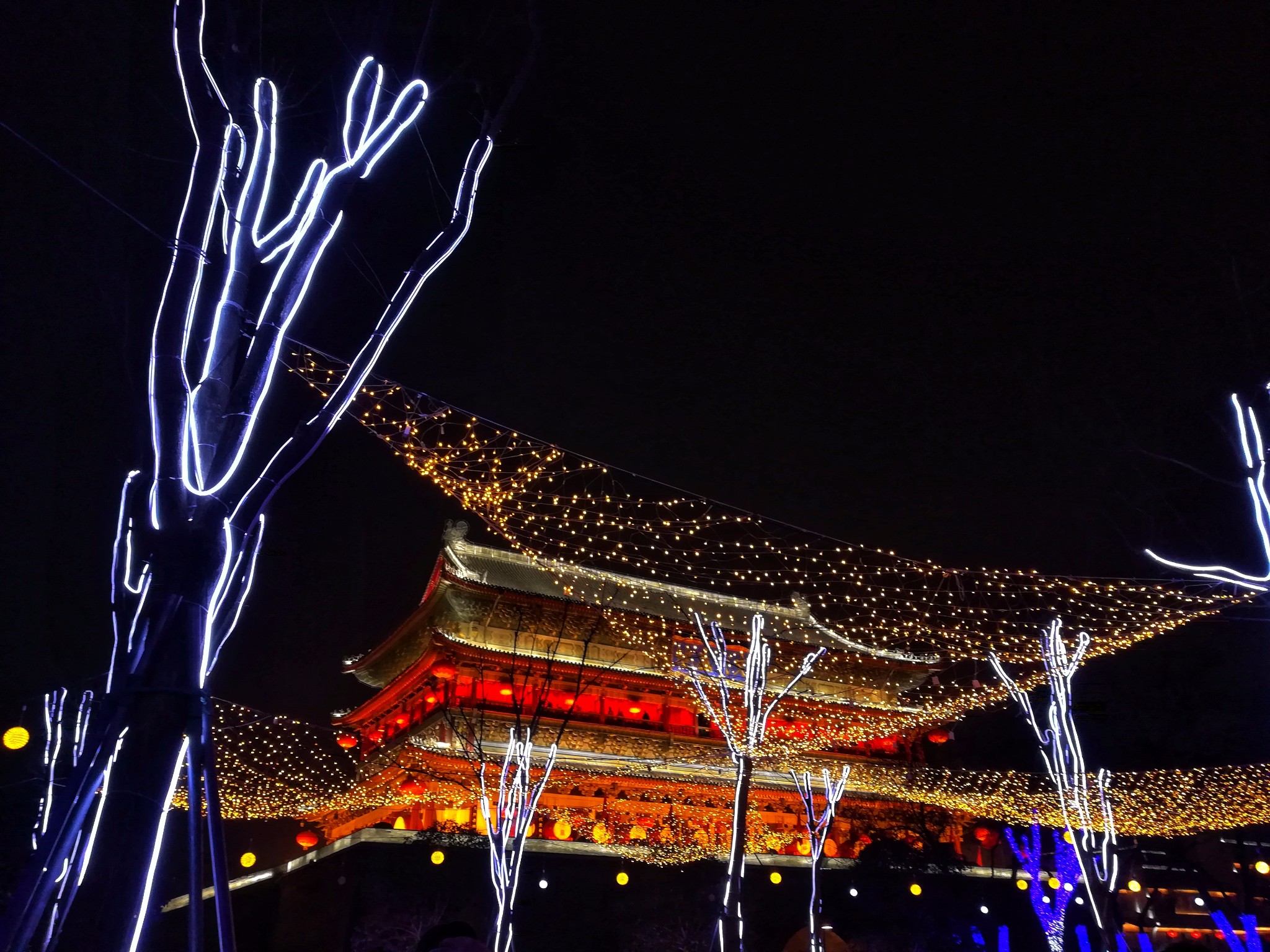 夜景,灯火阑珊下的西安,色彩斑斓。