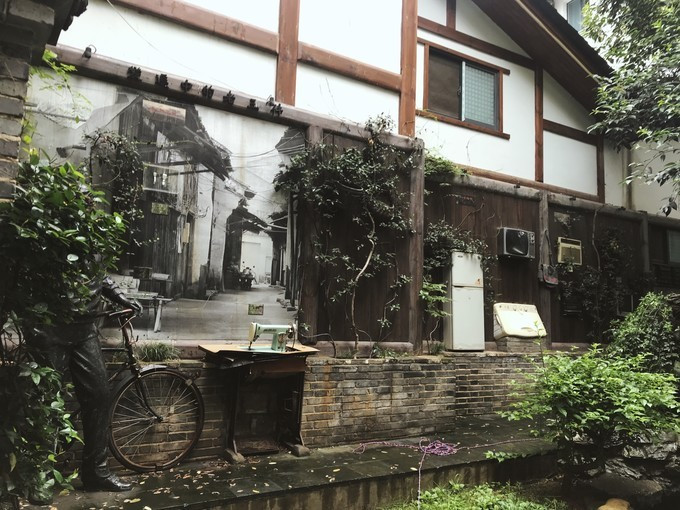 不能进去略遗憾,我探头探脑的只能门口痴痴的看一眼,园子算得上这条街少有的看点之一了吧,左面墙上发现了富有年代感的“老三样”。