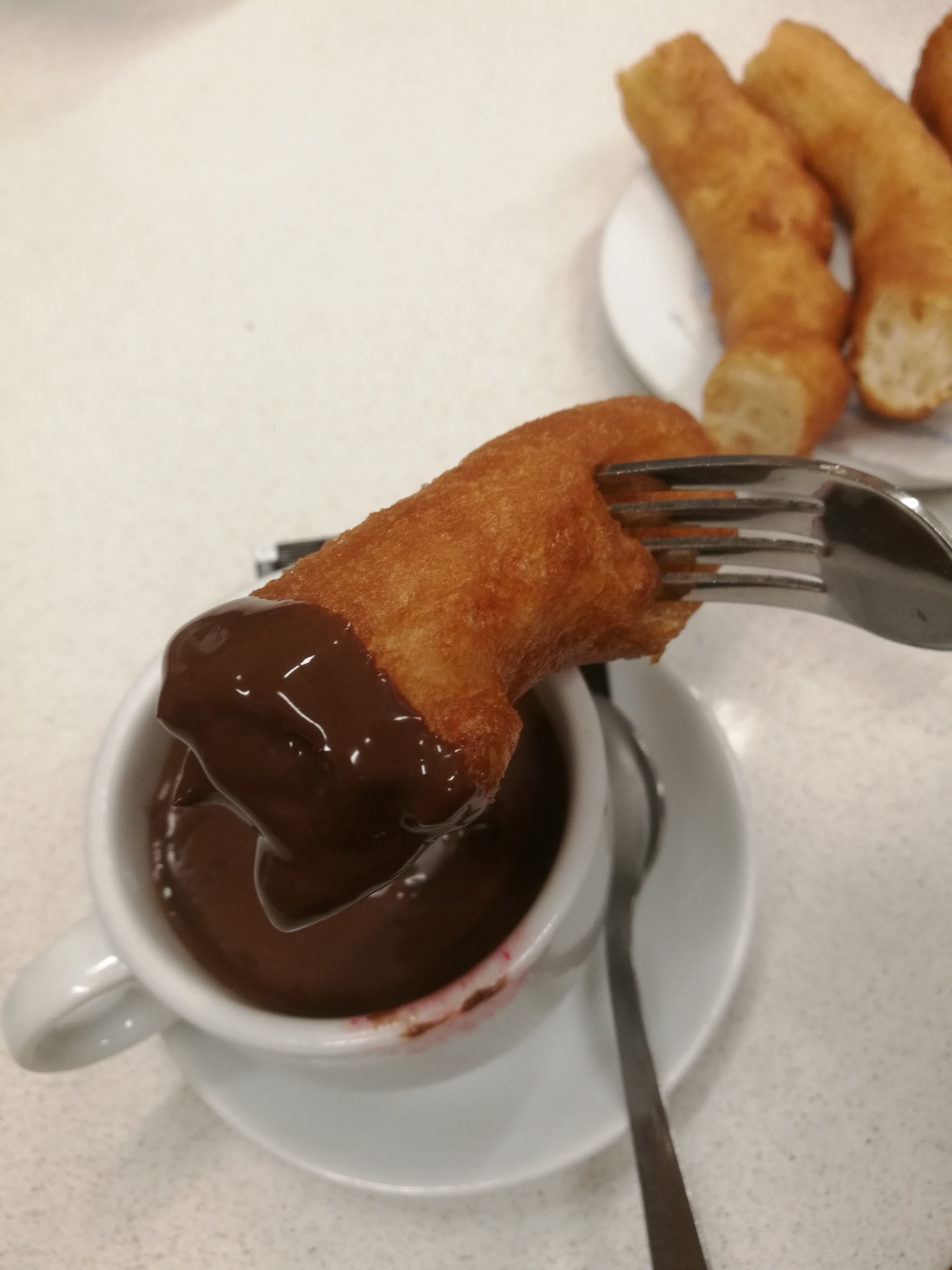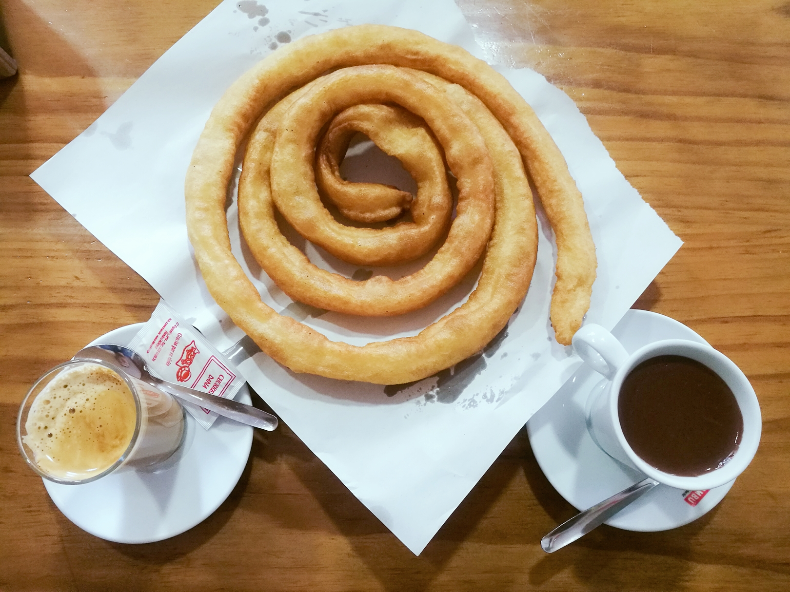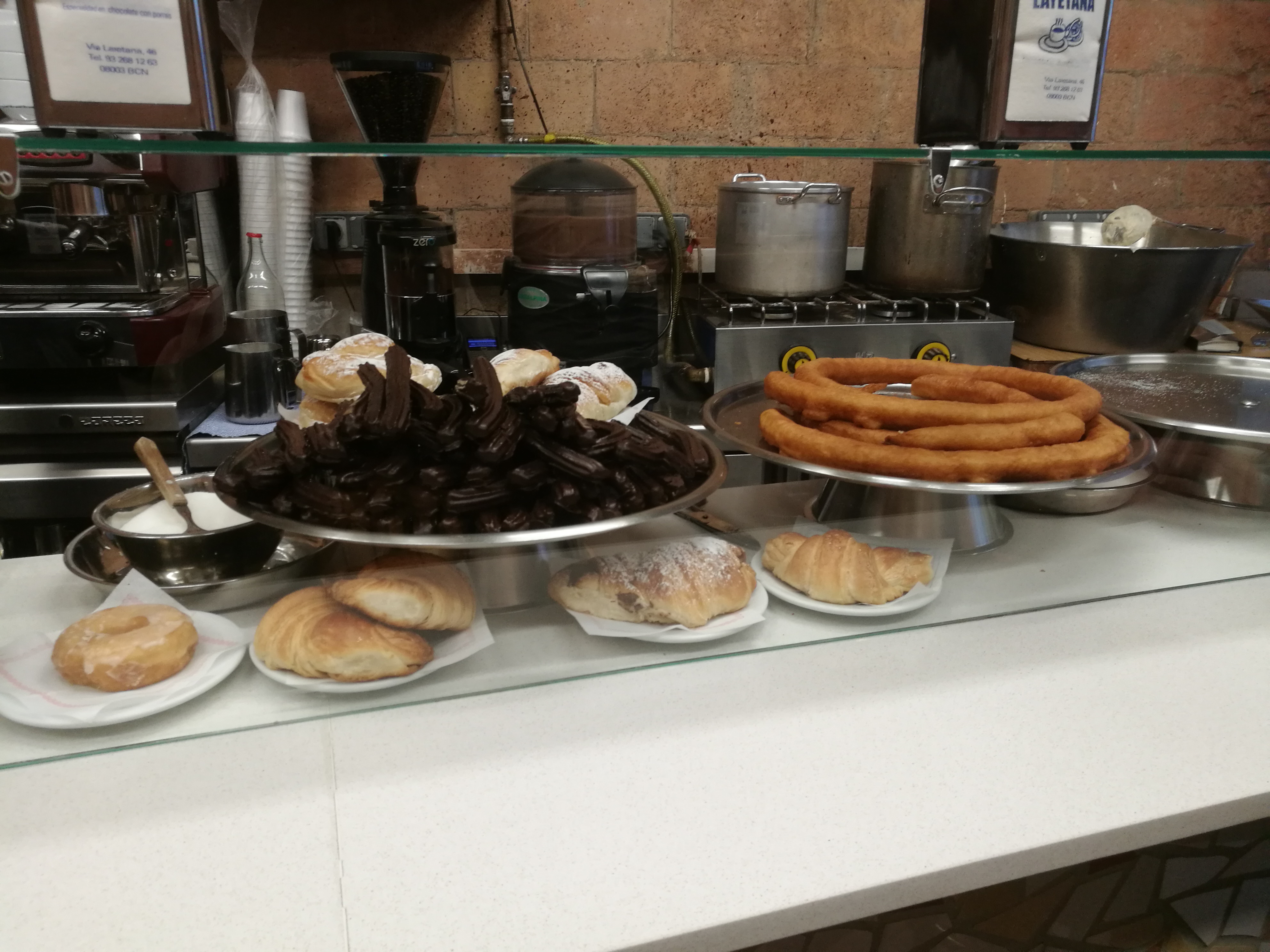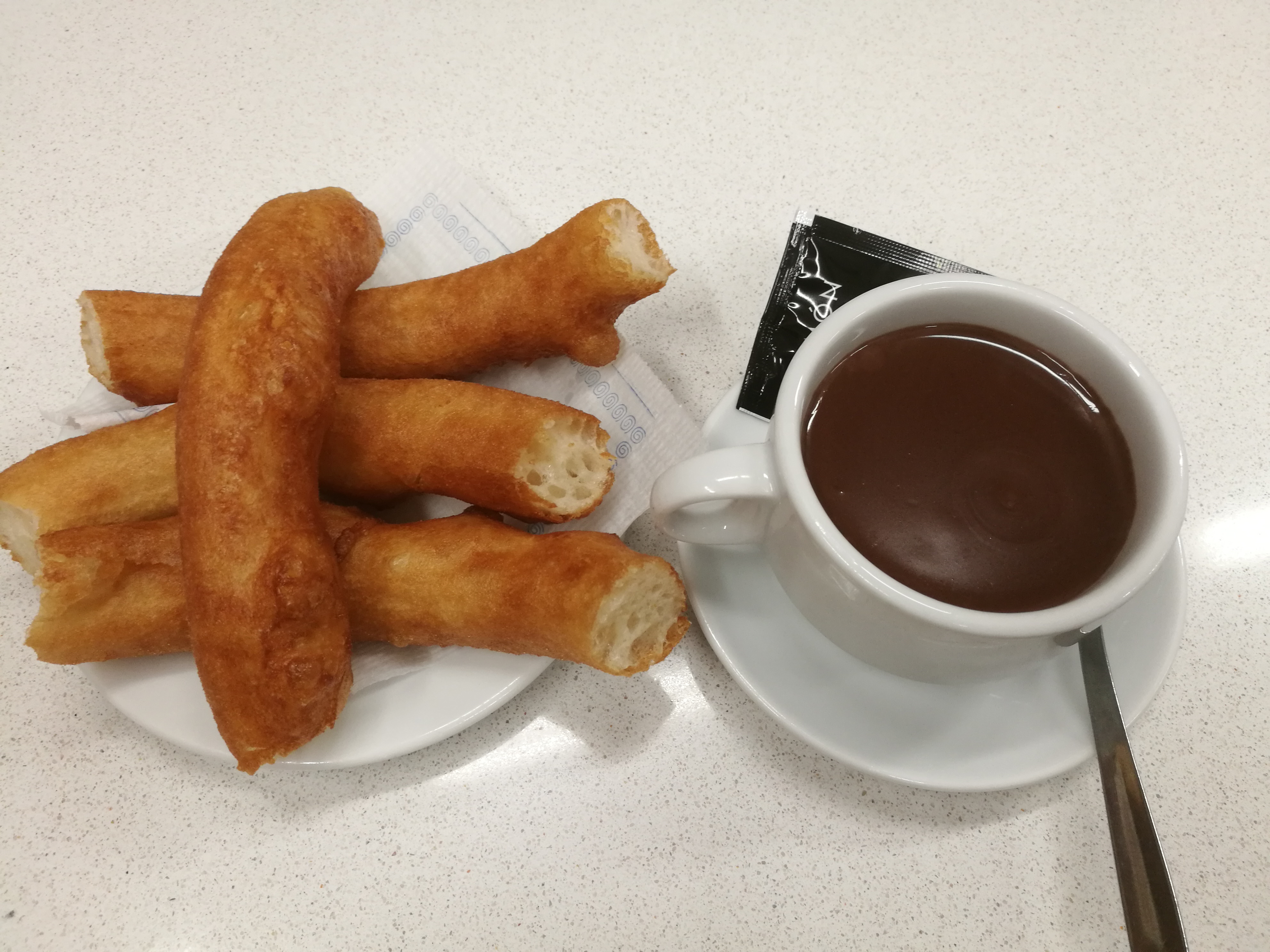 第二天早起去了附近的早餐店(店名:Curreria Laietana)吃西班牙油条,老两口经营,好吃。其实国内也吃过啊,吉事果~ 入乡随俗,在西班牙的这些天几乎每天早上都吃这个,配热巧克力真不错。