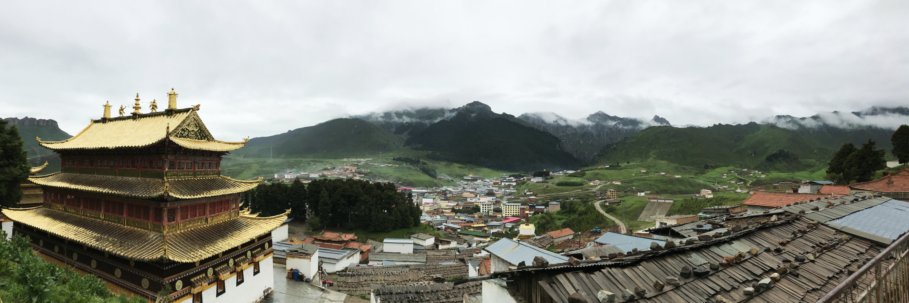 站在赛赤寺寺庙建筑群的高处往下俯瞰,拍了张全景。左上角金顶建筑群是赛赤寺,近处是赛赤寺的僧人居住区,右上角远处山沟里的银色那块是四川格尔底寺,中间红黄房子处是郎木寺镇的居民建筑。