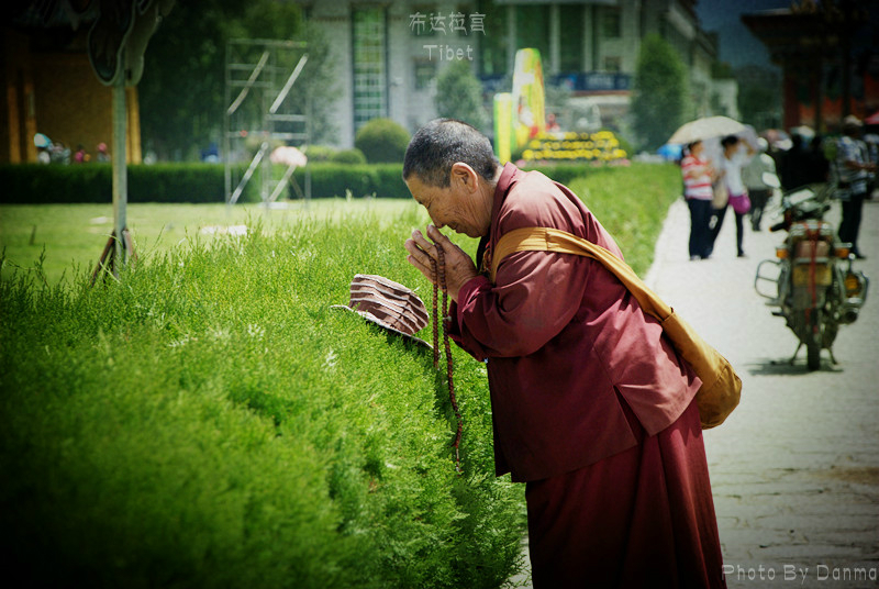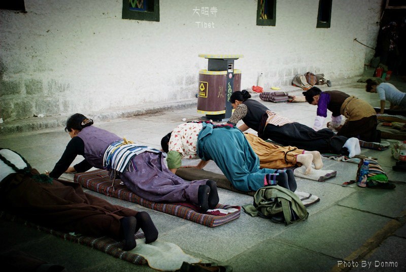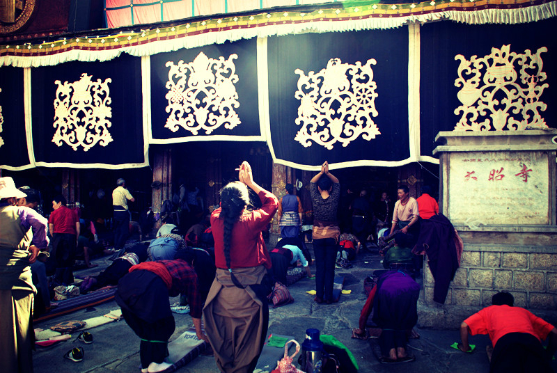 寺门口,虔诚的信徒。很多信徒是从青海 、甘肃 、四川 等全国各地的藏区一路磕长头而来,有的没有到达拉萨 就死在了路上,对于这种信仰深深敬畏。