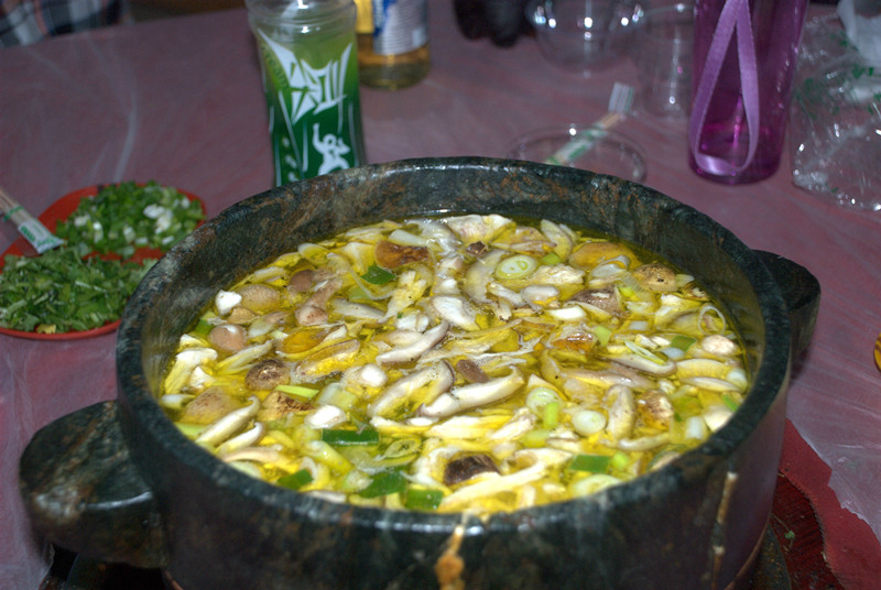 天色渐渐暗去,我们启程返回八一镇,由于山路崎岖和限速再限速,80公里的路程开了2个小时。9点多才吃上晚饭。不过这是为数不多的一次美餐。林芝 特产-石锅鸡。