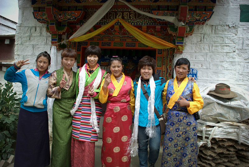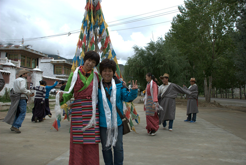 照片中穿藏袍的三个妇女,在景区和游客合影同时收取费用,她们经常在游客拍照时硬是凑到你旁边,要是没注意按下了快门,你就掏钱吧,算是援藏吧。