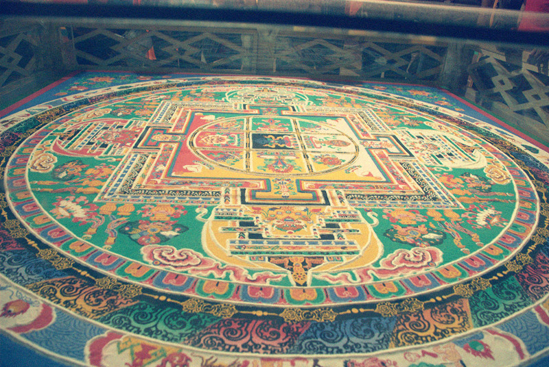 尼洋阁镇馆之宝--沙画坛城。喇嘛大师呕心沥血,用多种贵重金属和矿石磨成颜料绘制而成。