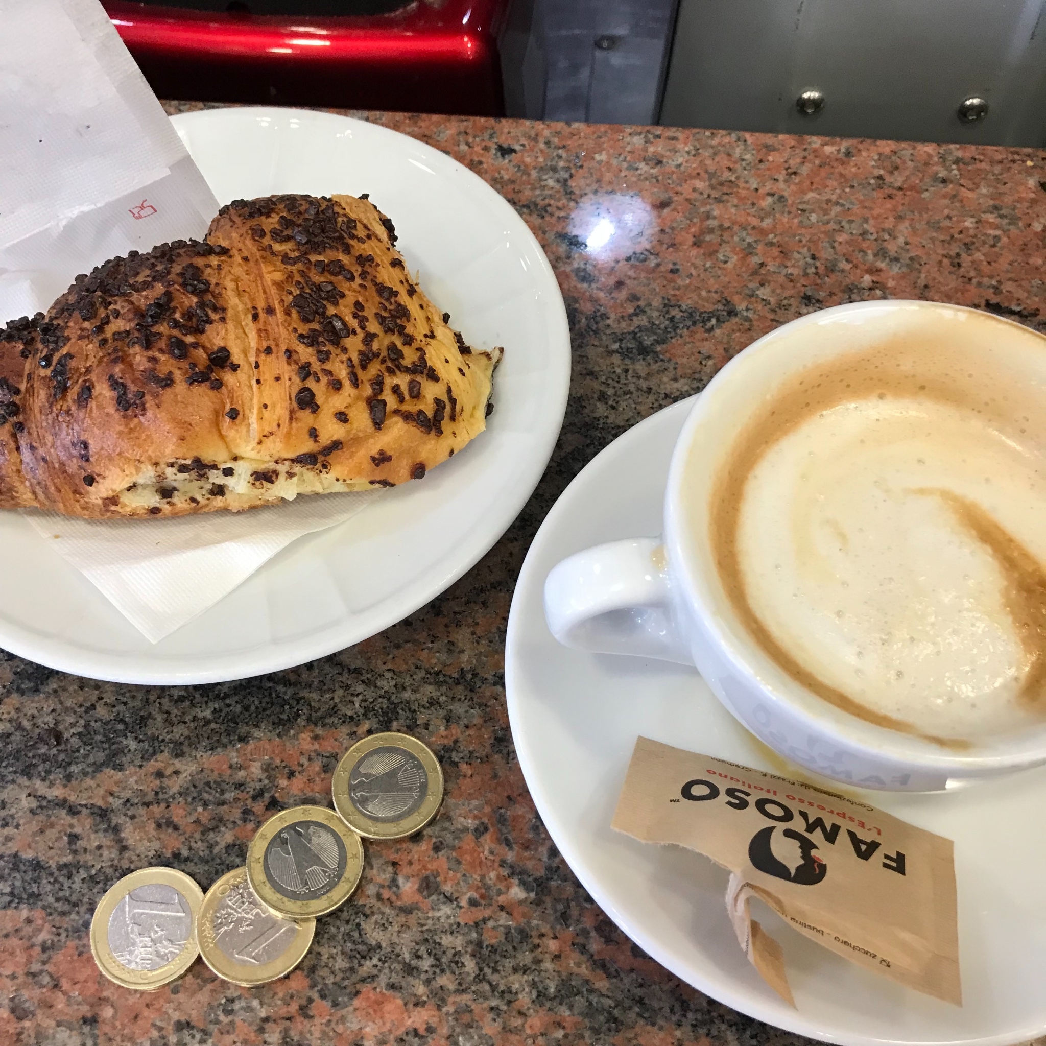 意式早餐的经典搭配,可颂加卡布,2欧(某些bar是2.2欧)。后面大概一周多的行程,除了酒店提供的自助早餐外,全是这个搭配解决早餐问题。个人很喜欢,对于天秤座来说,不用选择也是一大幸事。