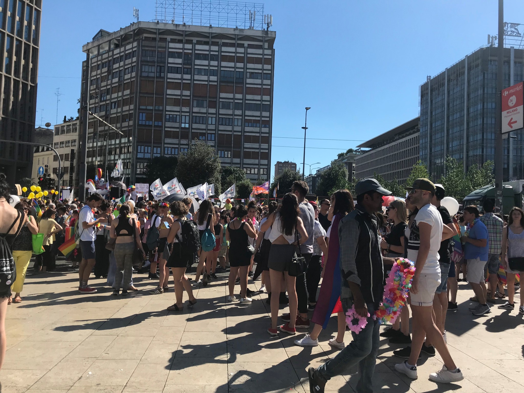在火车上的时候,已经发现很多年轻人做了游行装扮。到了车站门口,才发现是米兰骄傲月的pride游行。和车站门厅悬挂的艺术装置,表达的意义不谋而合。