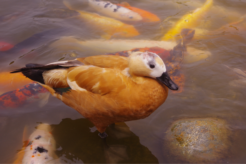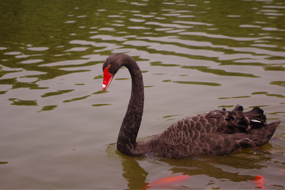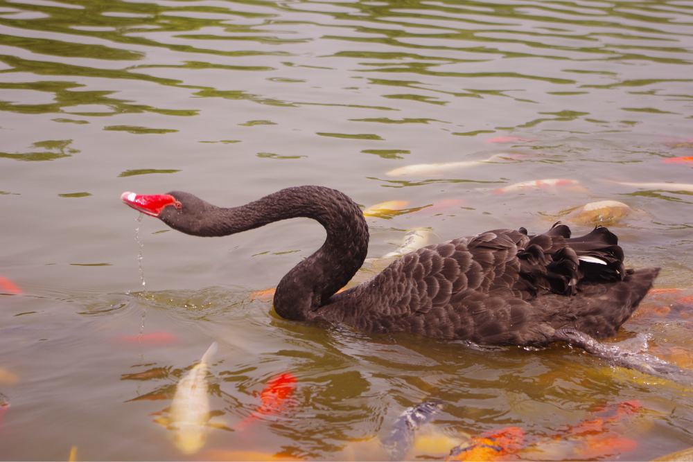 优雅的黑天鹅,底下是没出息的锦鲤,就为了点吃的,甘愿被鸟踩在自己身子上,哎,枉费了那一身精美靓丽的衣裳咯。