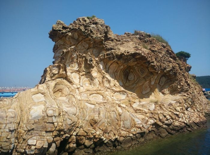 火车从青岛到大概要一个半小时,酒店订在了火车站附近,有公交车直达,在酒店休息了一晚。第二天的第一站是花斑彩石风景区。从宾馆要坐一个半小时的公交车,注意,要自带干粮!因为从公交车上下来后,往风景区走是一个人都没有~简单的说,就是特别慌。成功到达景区后,询问了一下景区的工作人员,她告诉我们,目前是淡季,没什么人。好吧,确实没什么人,景区除了我俩,就剩工作人员了,一次难得的体验。就是它∇,据说是寒武纪时期的石头,样子挺奇特的,花纹也好看~。