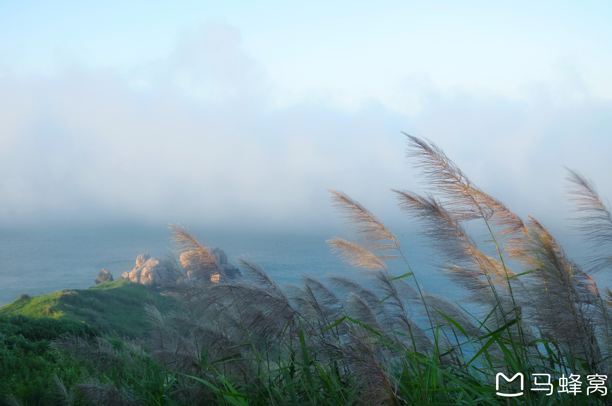 日出为大海平添了淡淡的红,因岛上雾气大,一切都显得朦朦胧胧,