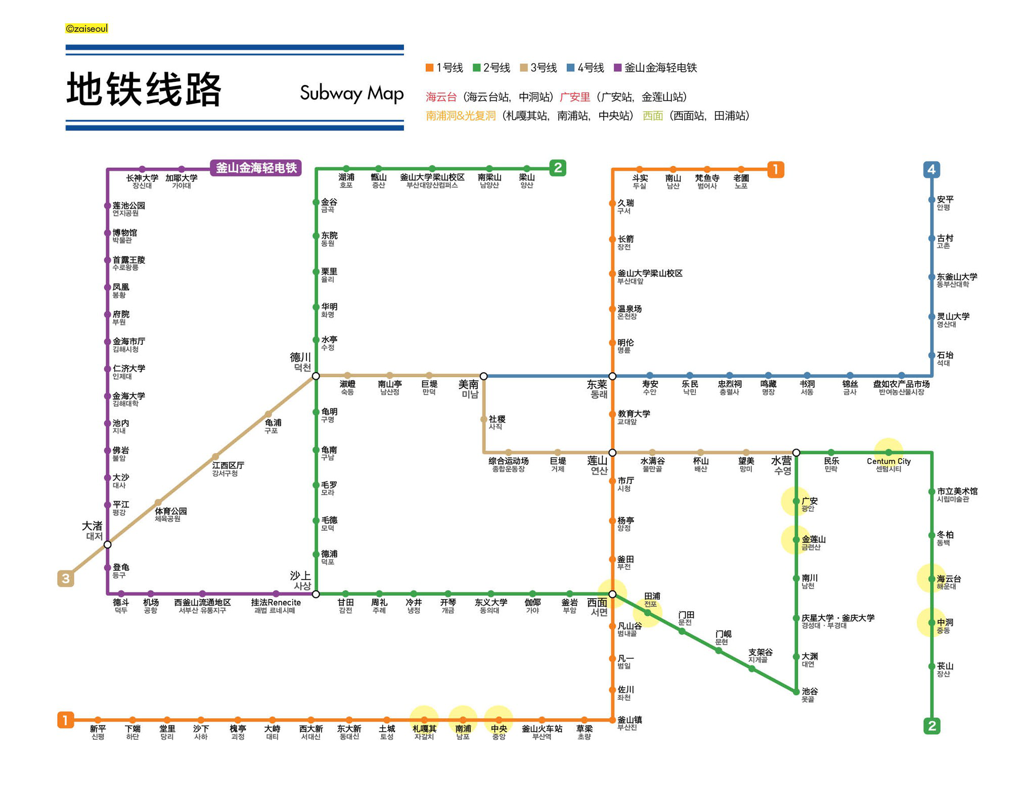 地铁是这里主要的出行方式。釜山的地铁可以说是很良心了,一共才4条线,外加釜山金海轻电铁(这条线路主要就是连接机场和其它几条市内地铁线的)。