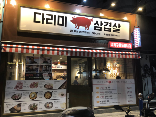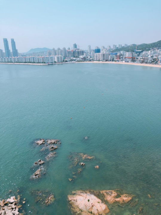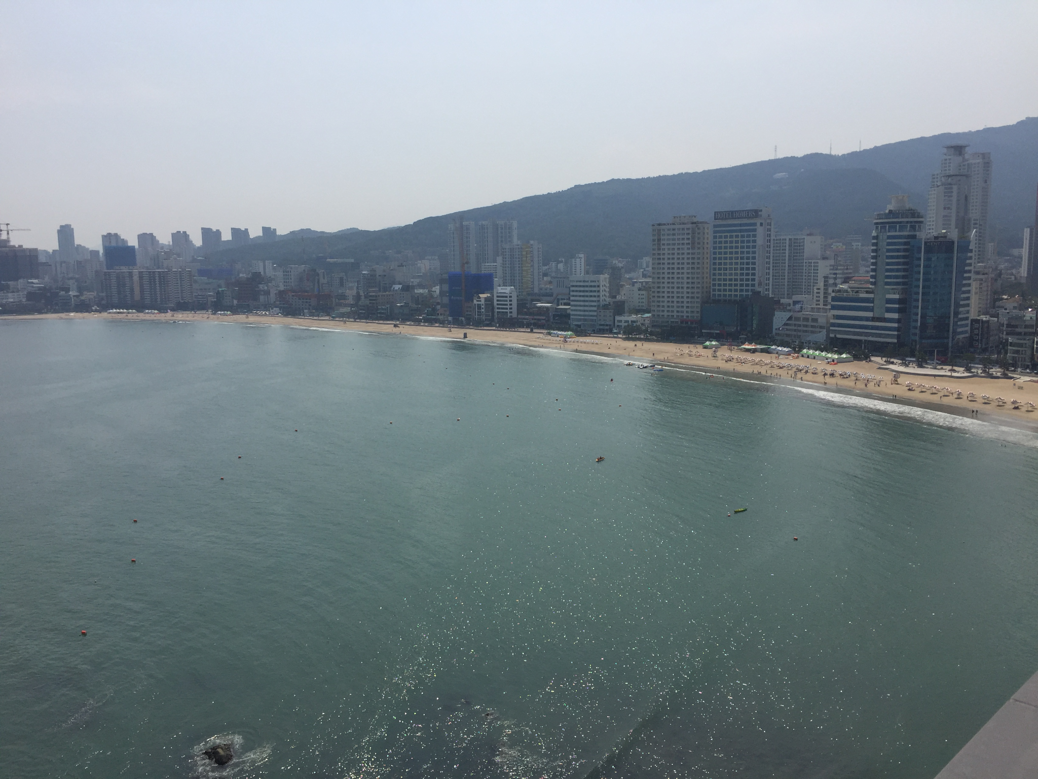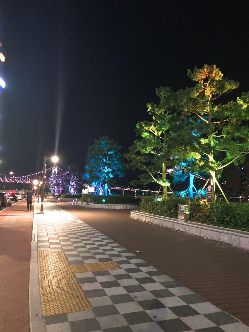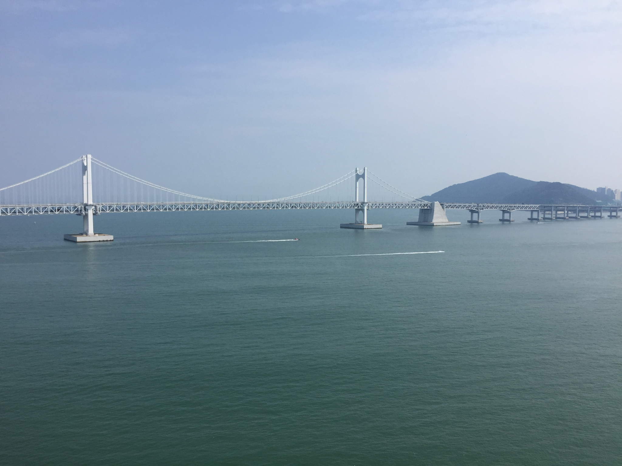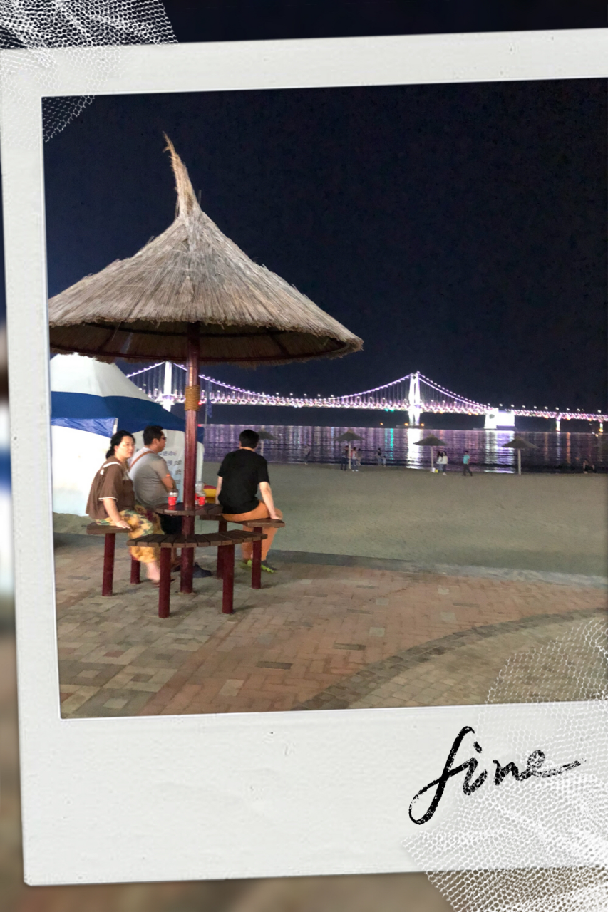 广安海滨路(是我强行从韩语的英文发音倒回汉语悟出来的)是一条繁华的商业街,沿街各种饭店和咖啡店。海滩边的广场到处有唱歌的民间艺人,水平很高。大家闲着没事就吹吹海风听听歌。