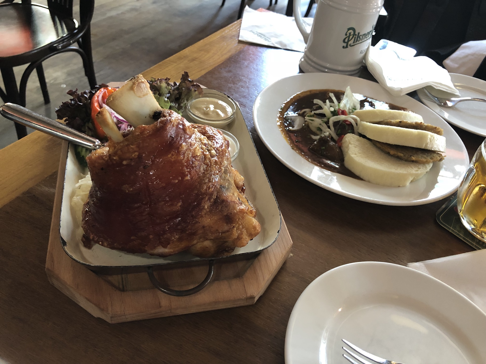 这一顿真的是我最不爱吃的一顿,大猪蹄子+红烧肉+大啤酒一共170不到,名字叫Kolkovna Celnice,性价比可以,大猪蹄子我吃了好几顿,味道就是还热的时候很脆,外焦里嫩那种,红烧肉味道还可以,啤酒我觉得很一般,在这里打包费很贵,我记得是8块,然后吃完后他找我要小费百分之10,我没有那么多给了他几块还不要,态度就简直了,虽然欧洲一般会给小费,但是没必要强制吧,我本来没有那么多难道要我破钱给你么。欧洲的服务态度都不是特别好。