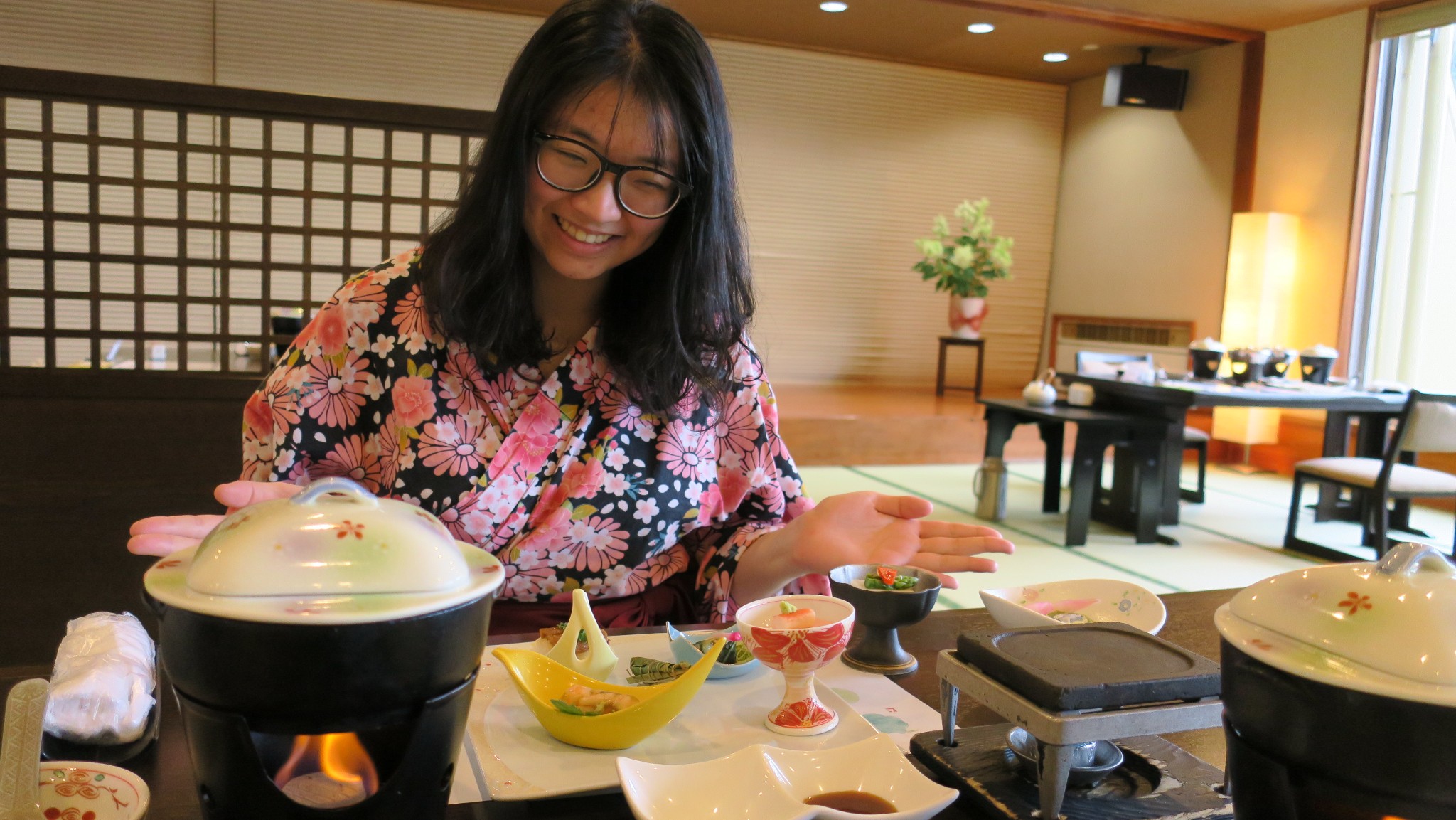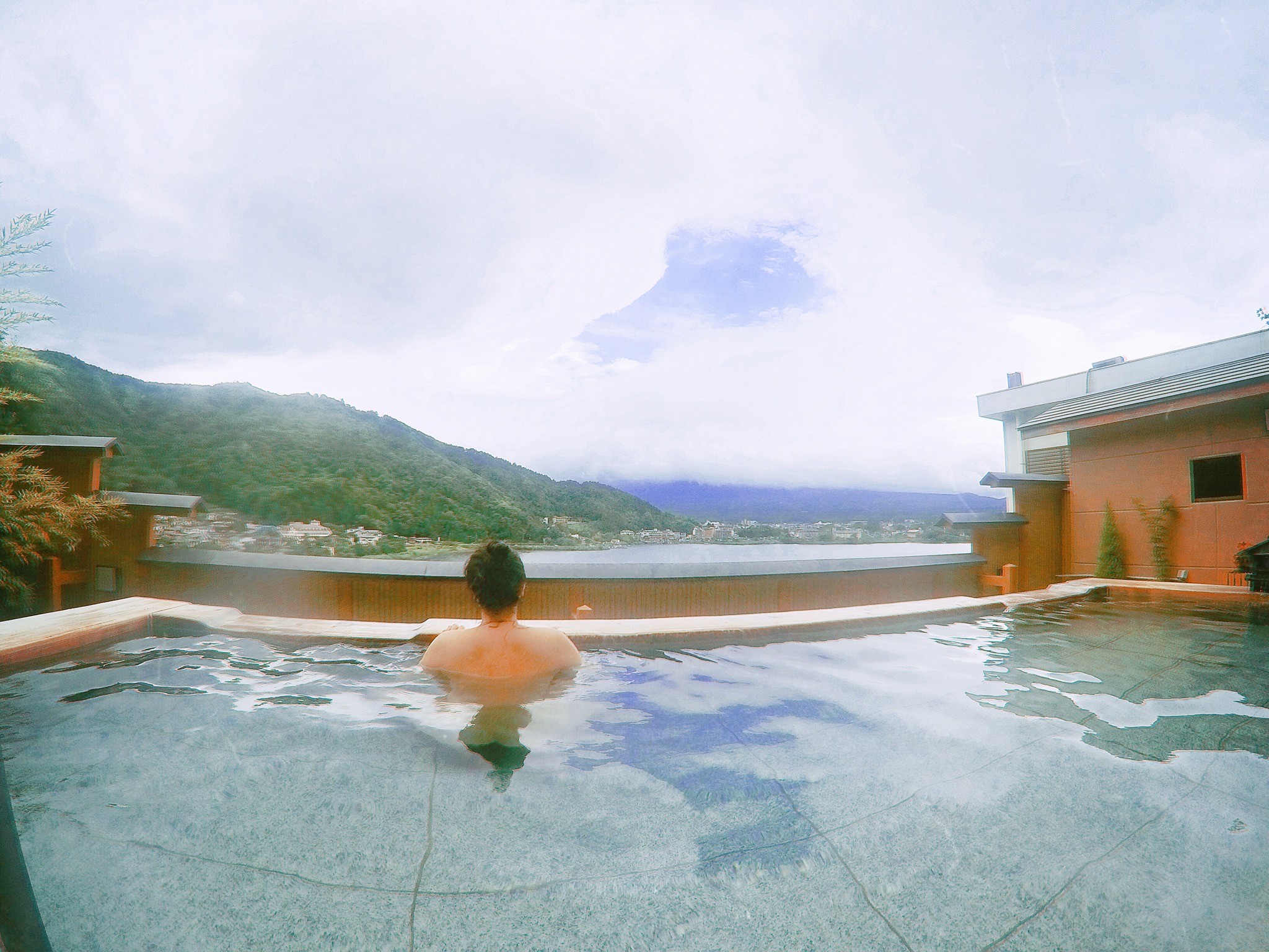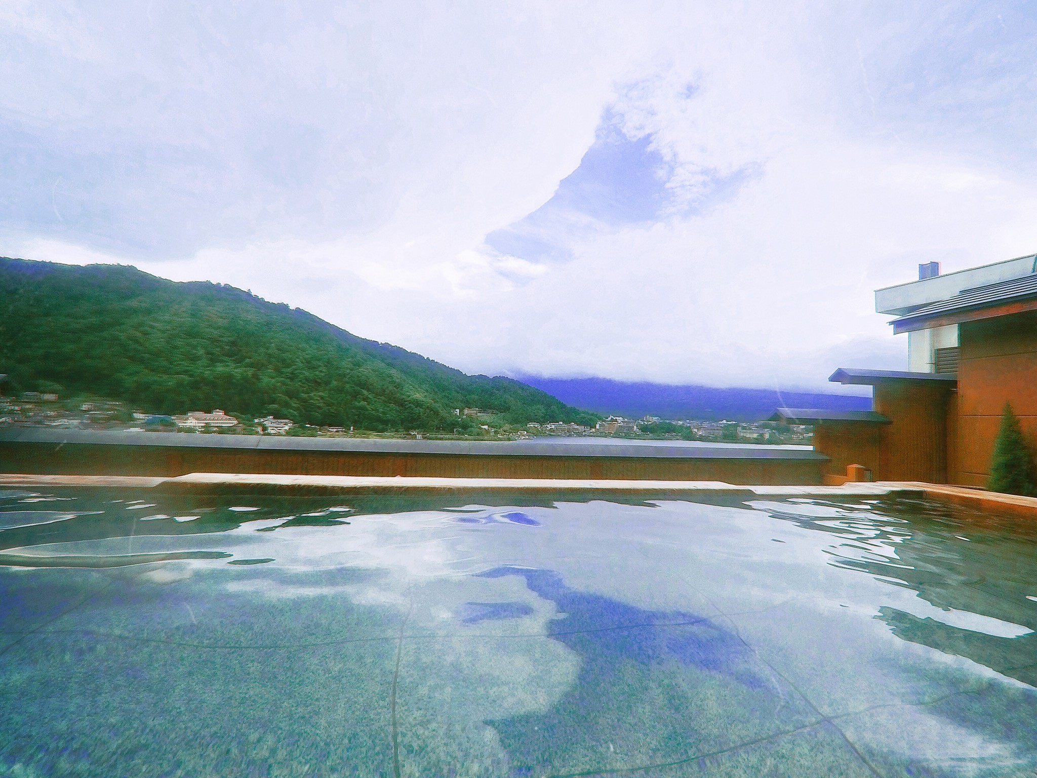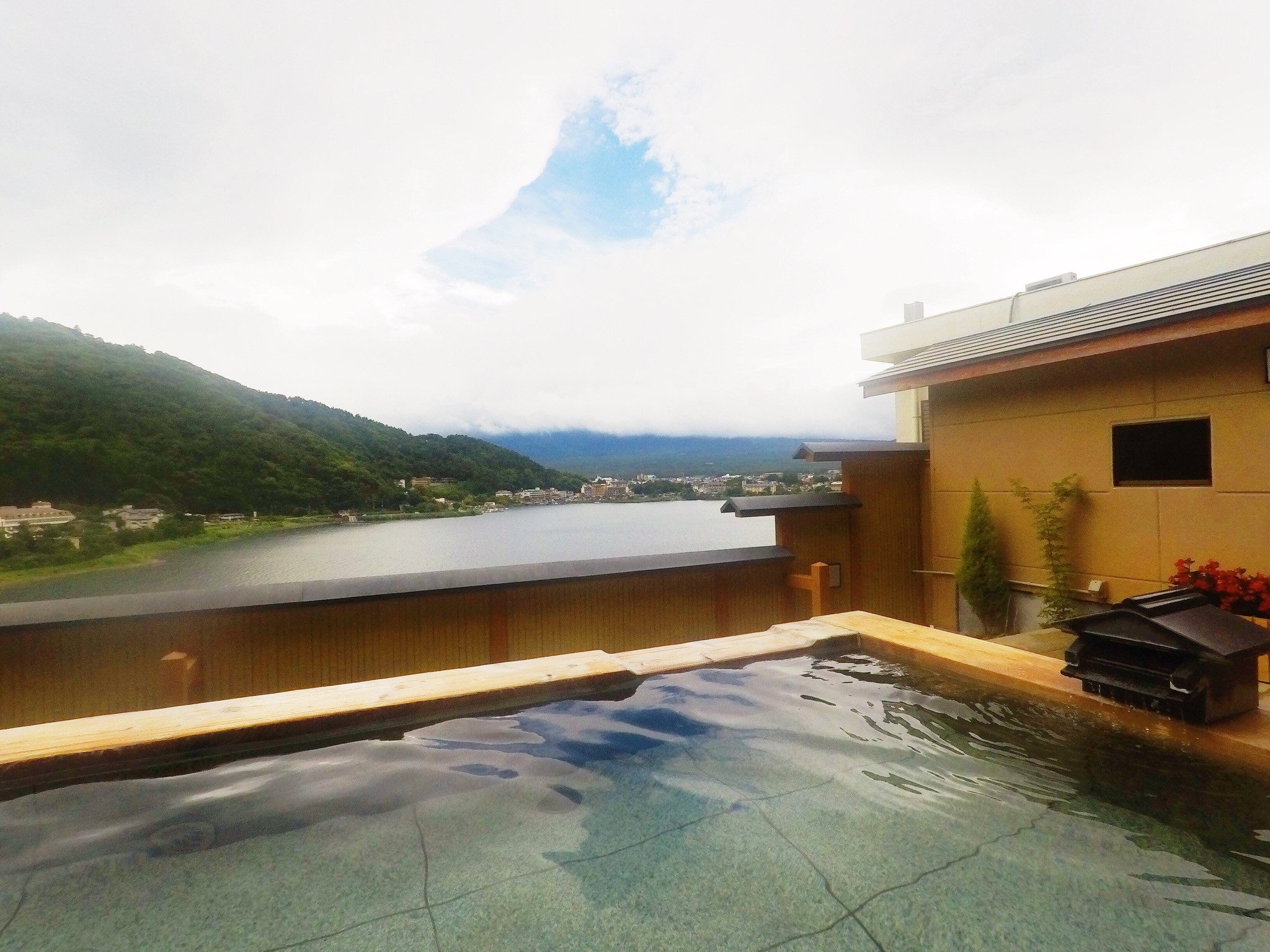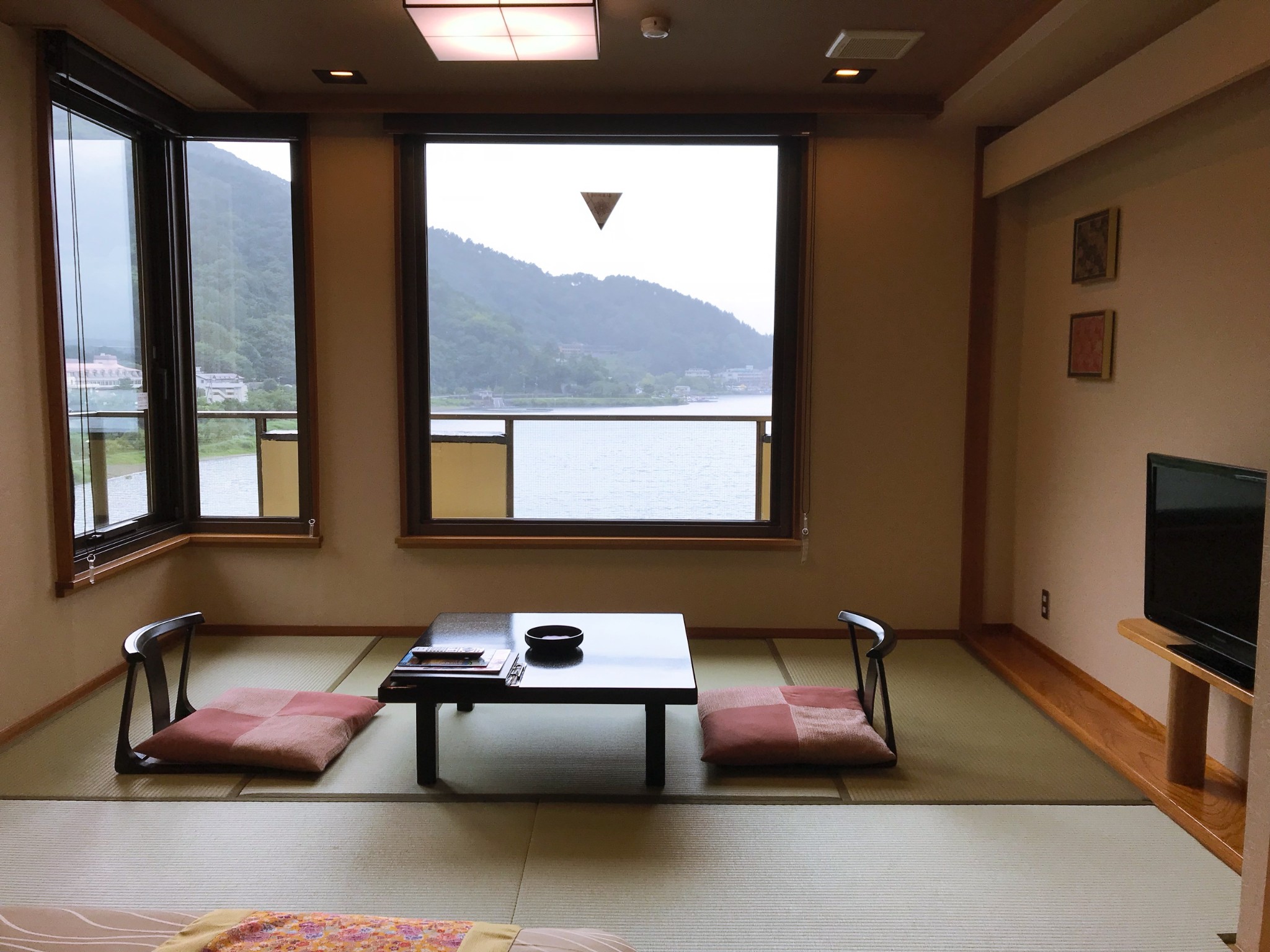 房间是无可挑剔的,正对着富士山景和河口湖景。