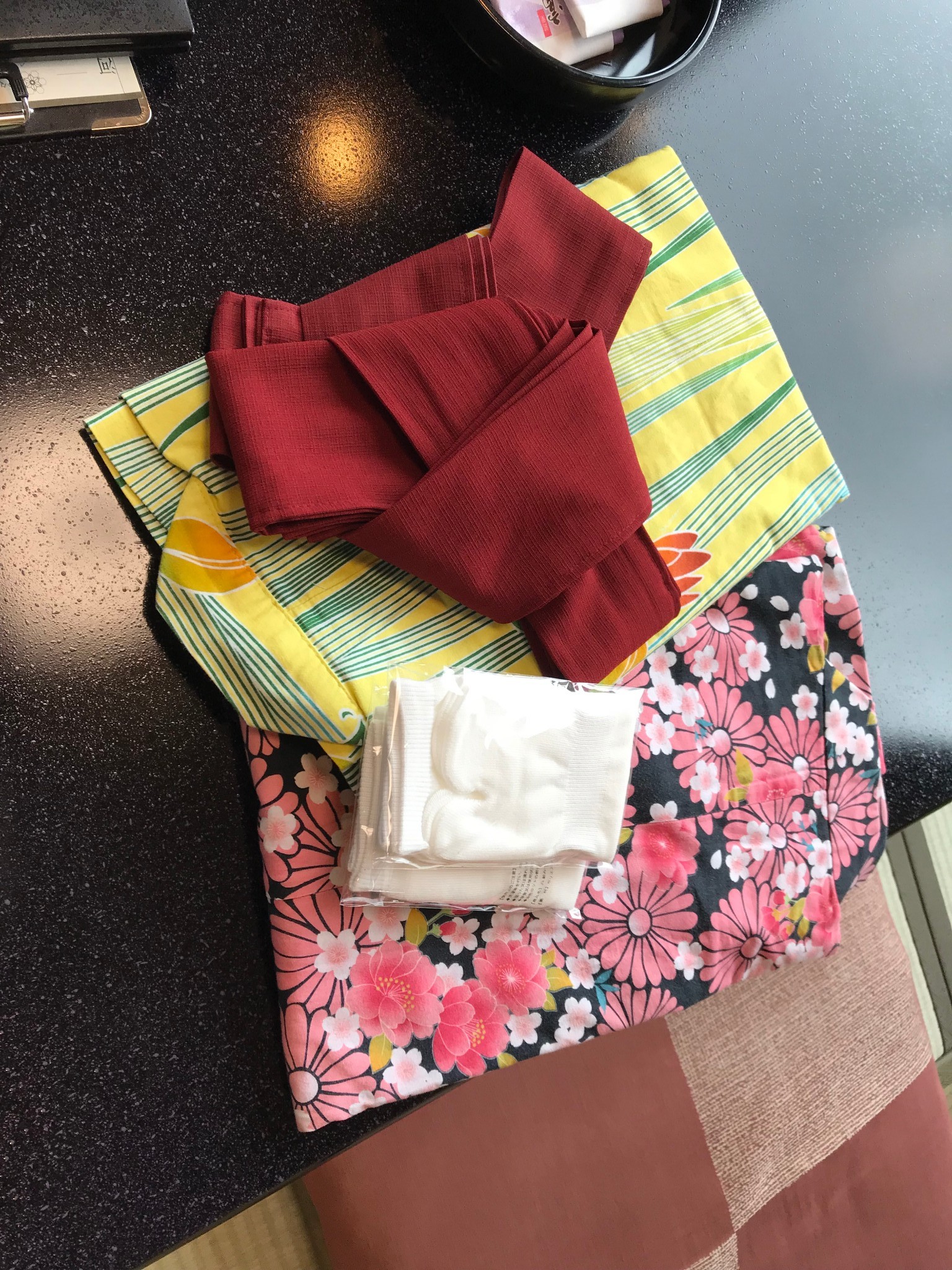酒店 check in时就可以一人选取一套浴衣来穿,还会送一双分指袜。