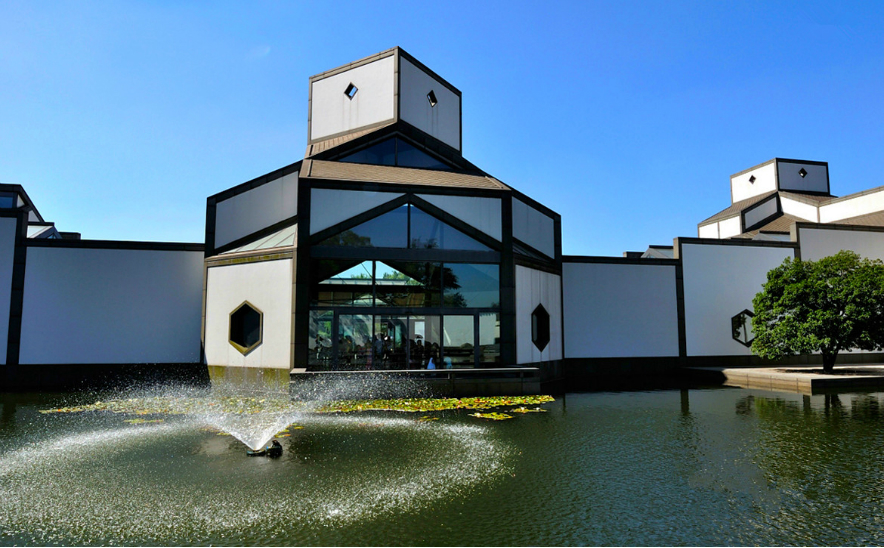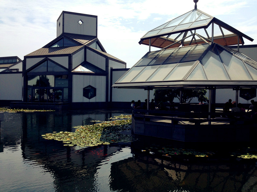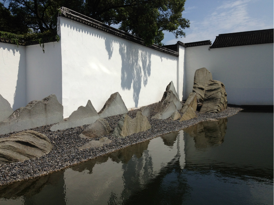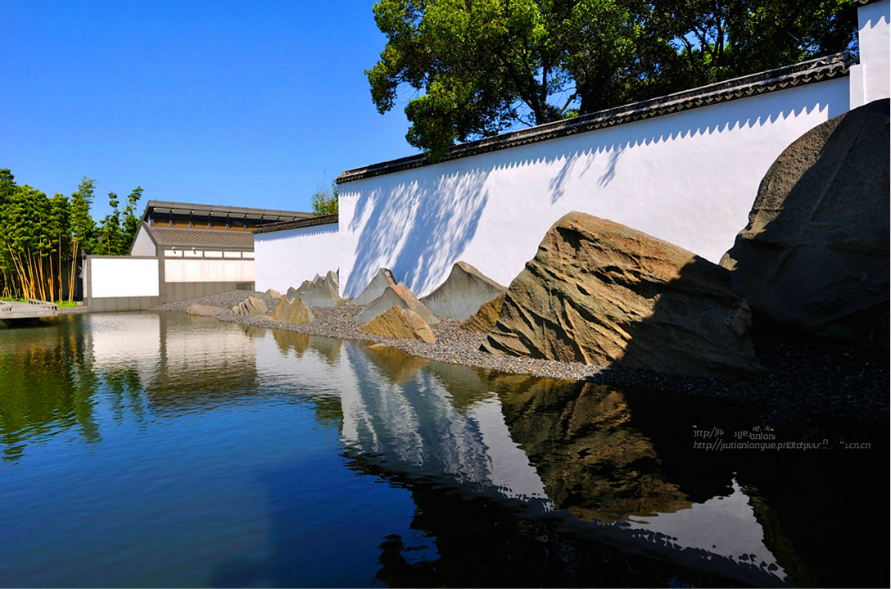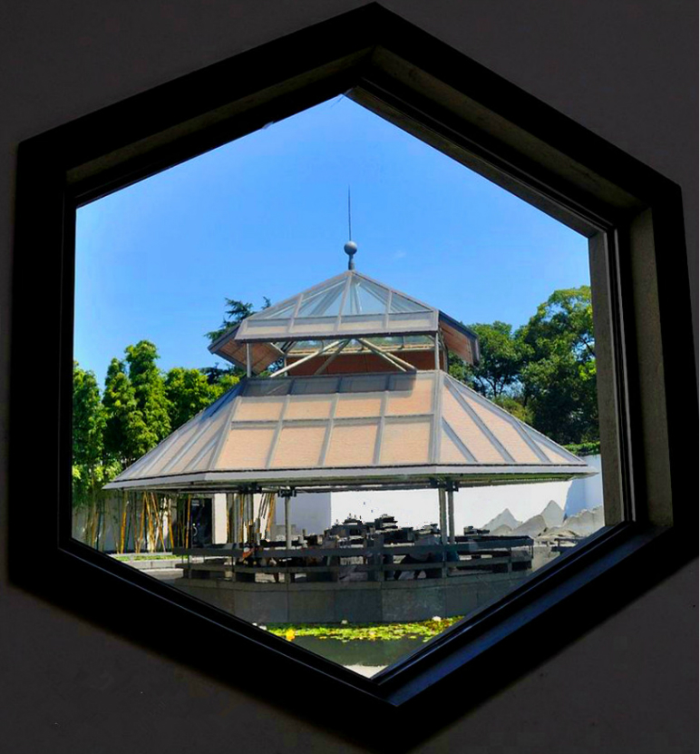 在整体布局上,新馆巧妙地借助水面,与紧邻的拙政园、忠王府融会贯通,成为其建筑风格的延伸。新馆建筑群坐北朝南,被分成三大块:中央部分为入口、中央大厅和主庭院;西部为博物馆主展区;东部为次展区和行政办公区。这种以中轴线对称的东、中、西三路布局,和东侧的忠王府格局相互映衬,十分和谐。新馆与原有拙政园的建筑环境既浑然一体,相互借景、相互辉映,符合历史建筑环境要求,又有其本身的独立性,以中轴线及园林、庭园空间将两者结合起来,无论空间布局和城市机理都恰到好处。 新馆正门对面的步行街南侧,为河畔小广场。小广场两侧按“修旧如旧”原则修复的一组沿街古建筑,古色古香,成为集书画、工艺、茶楼、小吃等于一体的公众服务配套区.