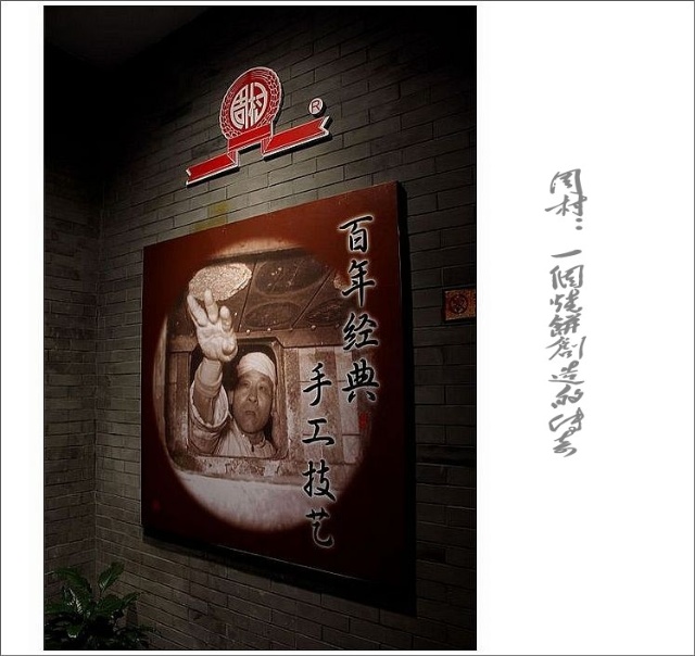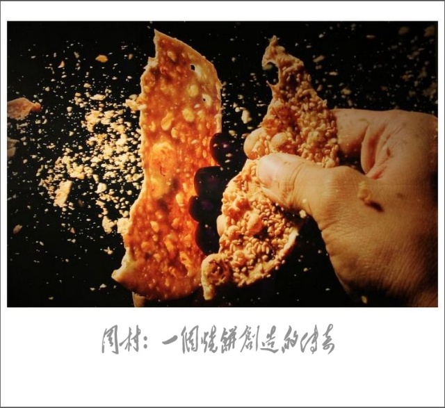 先上一张在周村烧饼博物馆里拍的宣传画:烧饼掰开,碎屑四溅,可见它的香酥松脆。