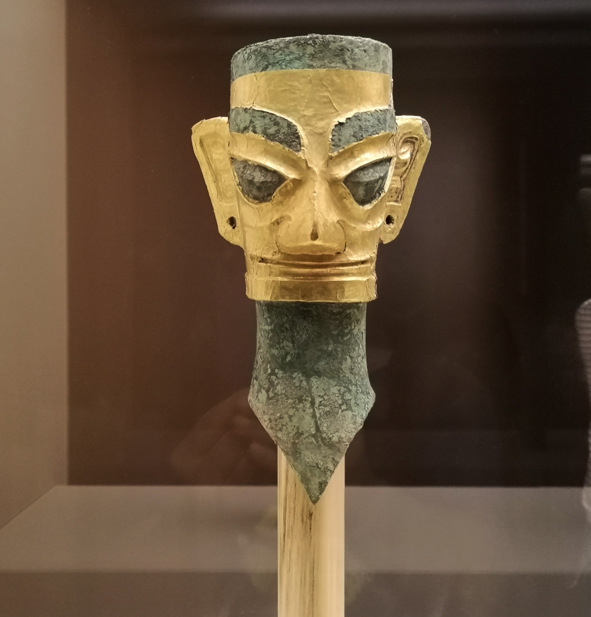 商 戴金面具辫发青铜人头像