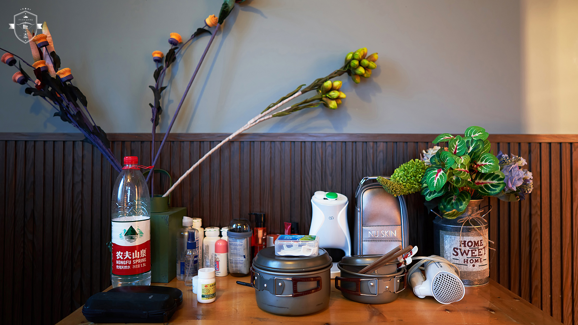 爸爸已经把我们的生活必须品全部摆了出来,使用起来和家里没有什么两样。