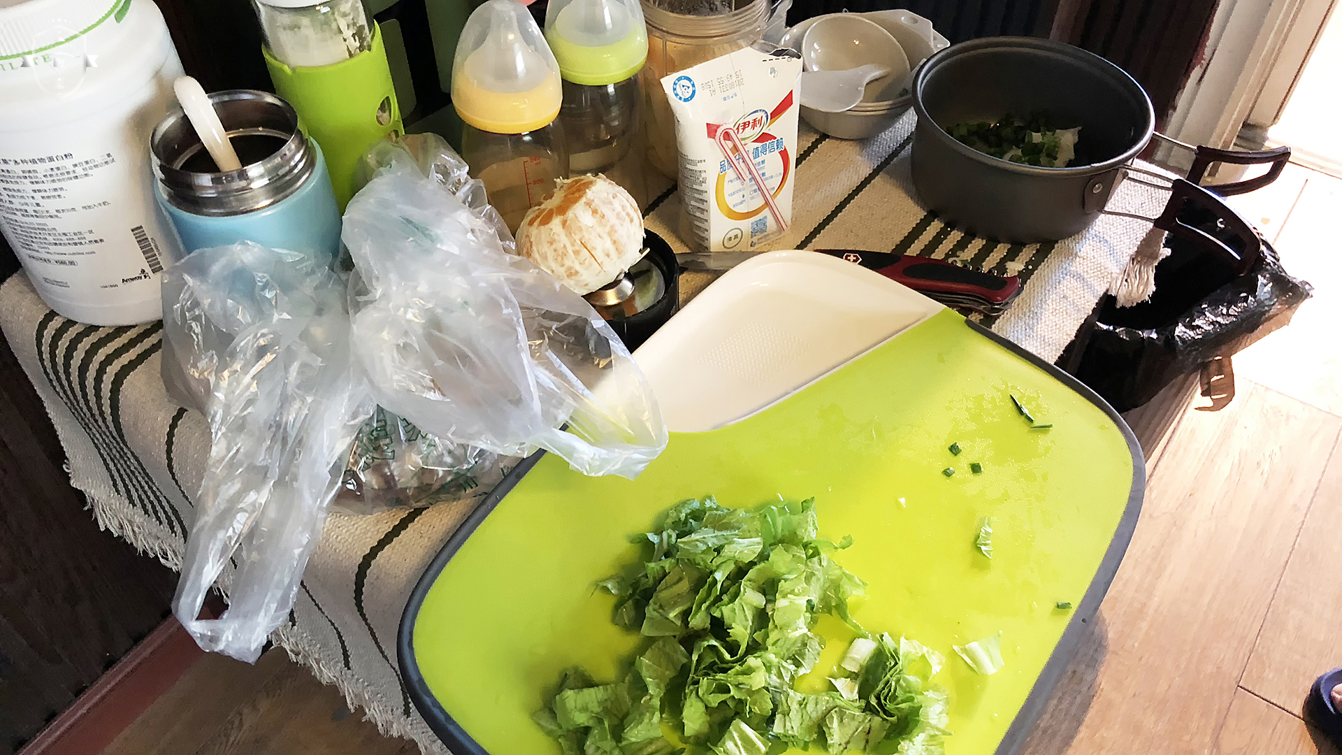 妈妈给我切好了蔬菜,煮了一碗香喷喷的蔬菜酱油猪油面~