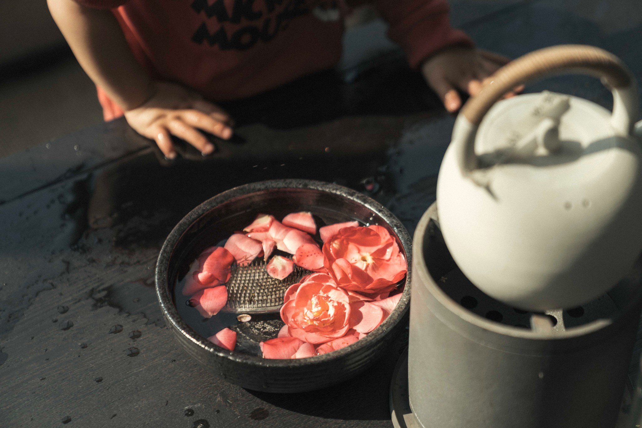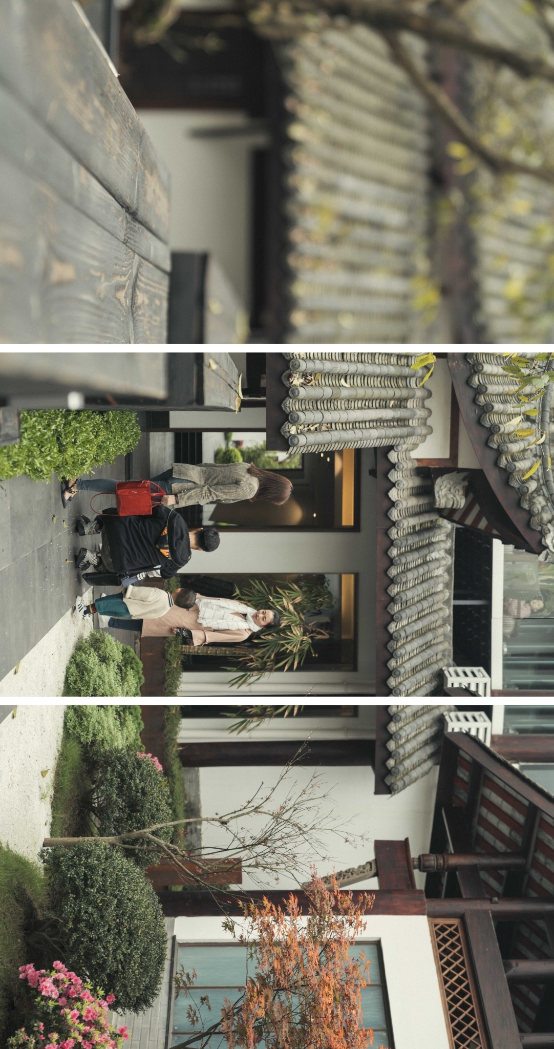 走出屋内,每栋小院里都有一个雅致的天井中庭,小朋友很爱在这里玩白色的小石,不舍离开。遇见阳光的造访,你会看到它随处洒下的光斑,落在小朋友的肩头,这个时候快快请出摄影师来沉淀光影。