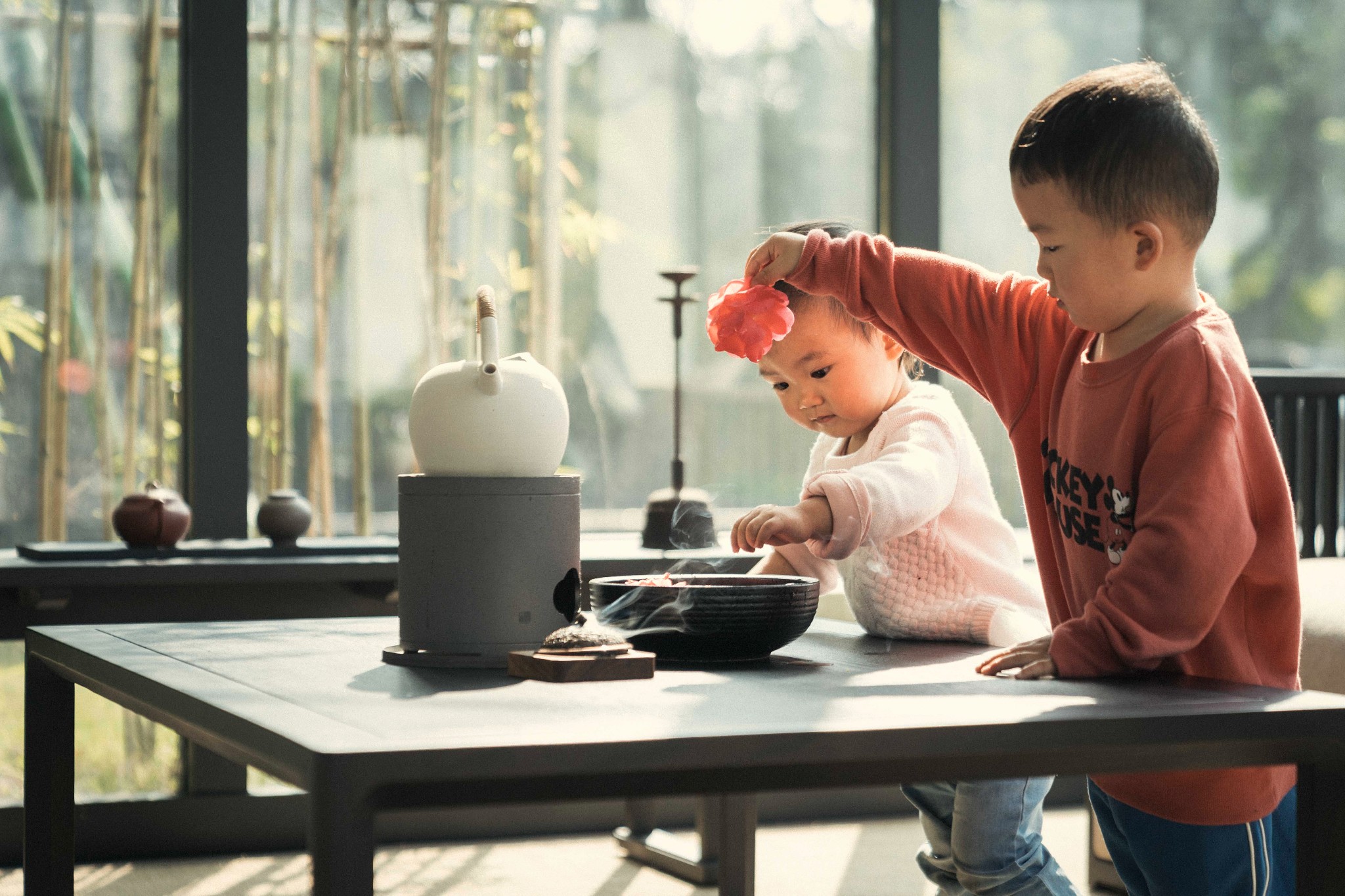 桌上摆放的茶具;飘零的花瓣;假山上一只正在休憩的鹦鹉;进门处一座“会发声的石头”,噢,太多的奥秘等着去探索。小朋友的每一次探索,都让我们大人心里一紧,因为到处都是陶艺孤品,贴着易碎的标签。