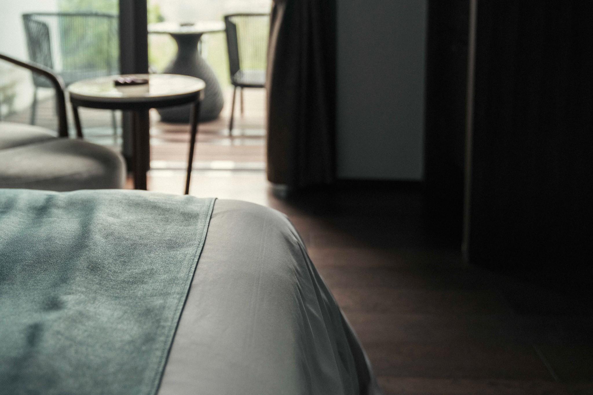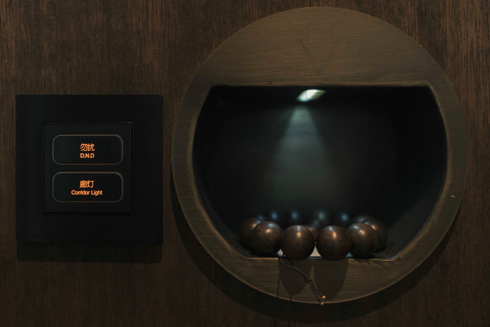 一席素衣的工作人员已为我们办理好入住手续,领着我们去到房间,他递来一串金丝楠木的手串,这独特的“房卡”,插入房门旁凹槽处,房间灯光系统应声而亮,别致的房间便淋漓尽致的展现在我们面前了。