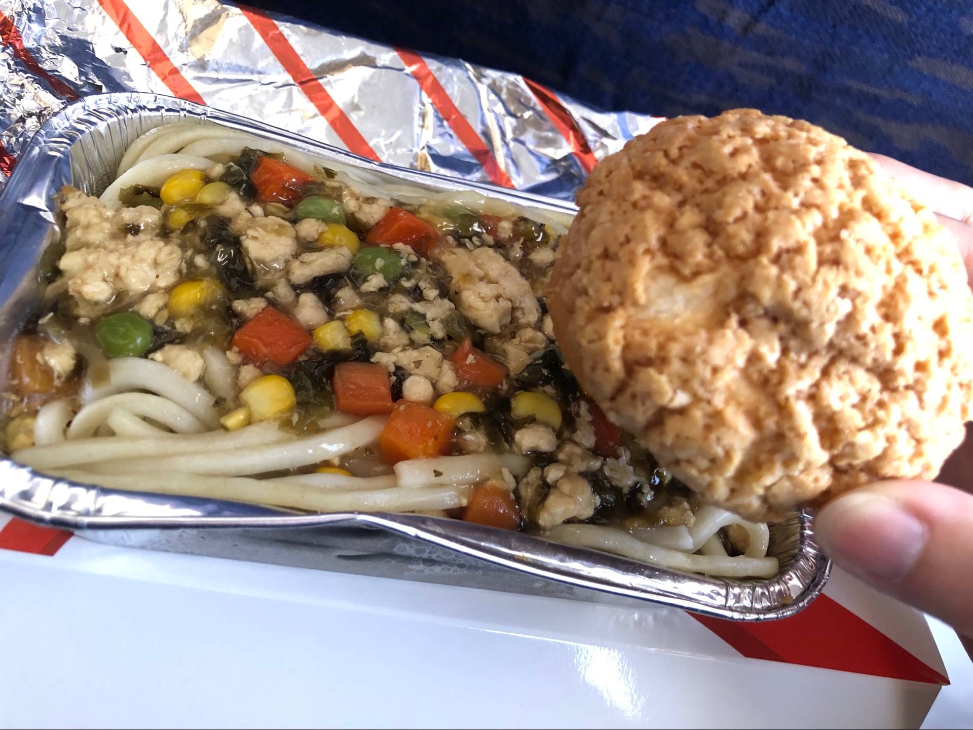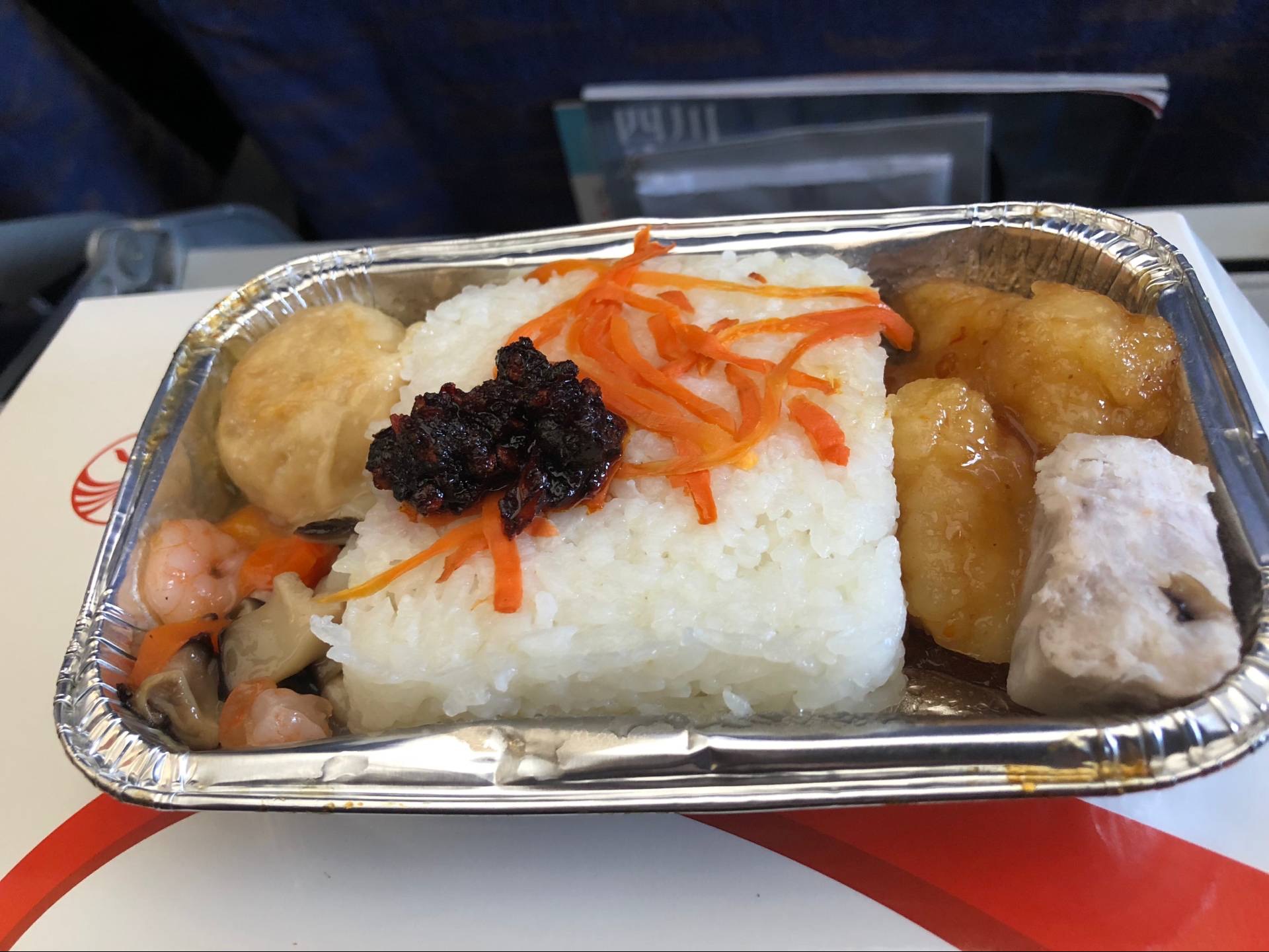 这次乘坐的是四川航空,对飞机餐有点小期待,两人分别要了一份双拼饭和担担面↓