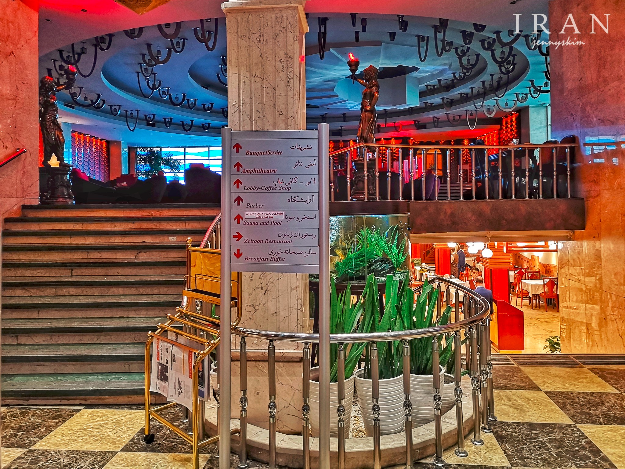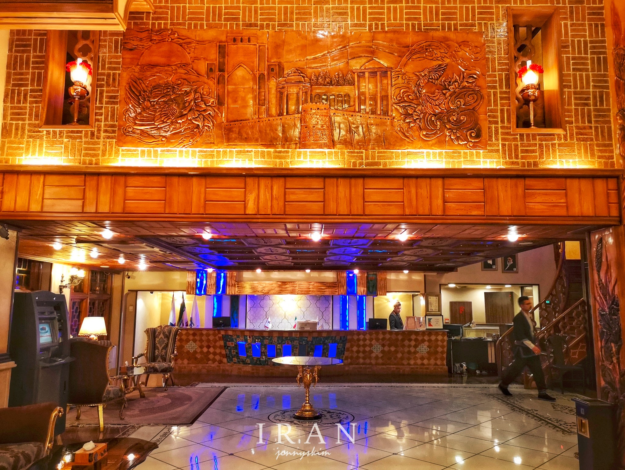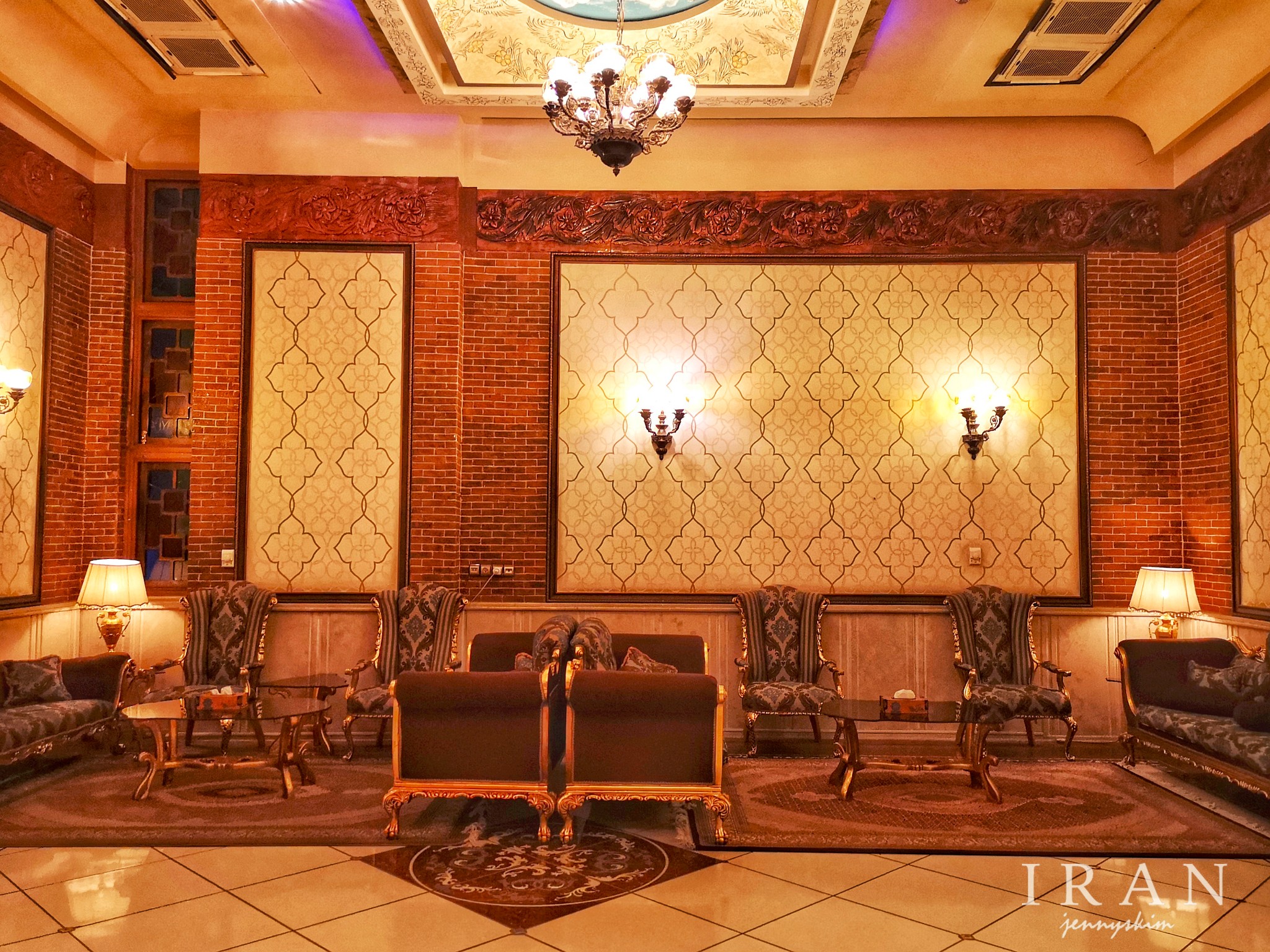 德黑兰酒店众多,价格偏贵,性价比算是全伊朗境内最低。我因为对伊朗情况并不把准,考虑到午夜时分才到达德黑兰,在德黑兰的时间也仅仅只有一个白天2个晚上,为了方便游览,我还是选择了LP推荐和携程评价都较好的位于市中心Ferdowsi Avene 的Ferdowsi International Grand Hotel Tehran。LP评价该酒店是深受团队游客欢迎的国际化酒店。步入其中,可能算是伊朗这个被各种贸易禁运及石油、金融等多渠道制裁了近几十年的国家里不错的酒店。大堂装饰透着古波斯文明的气息,餐厅虽然在地下,却明亮整洁。早餐算是比较国际化的波斯餐,品种多,吃饱没问题。标准间虽然普通平淡,但胜在干净整洁,卫生间和浴室设备也算不错。我尤其喜欢酒店电梯内满墙的古波斯镶金壁画装饰和大堂内一些有细节的浮雕装饰,时刻让人有穿越回古波斯帝国的失真感。
