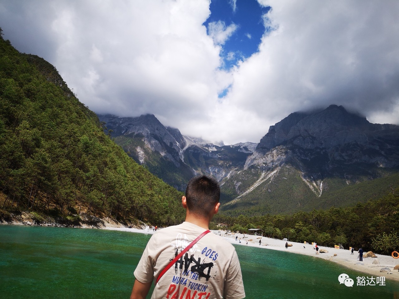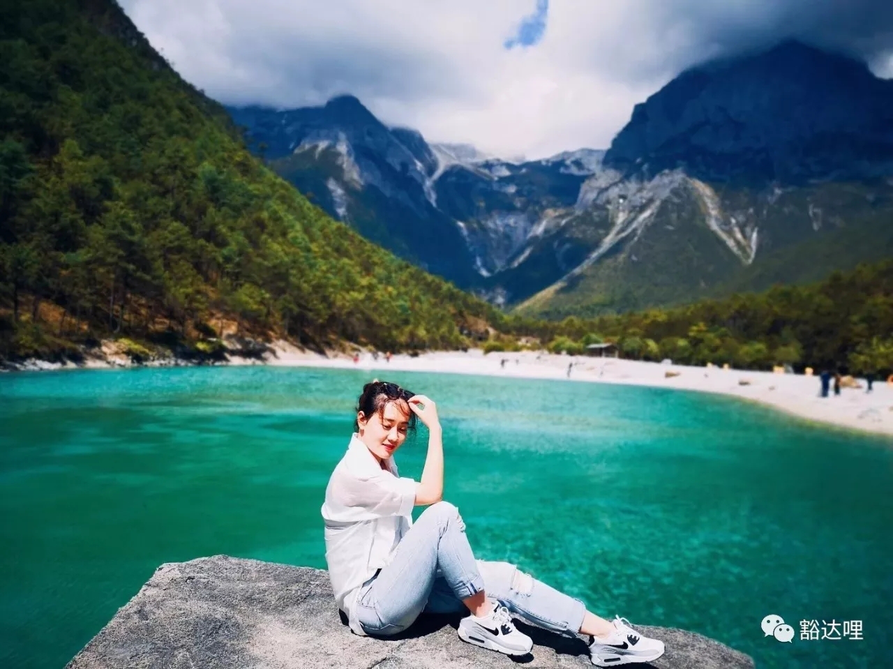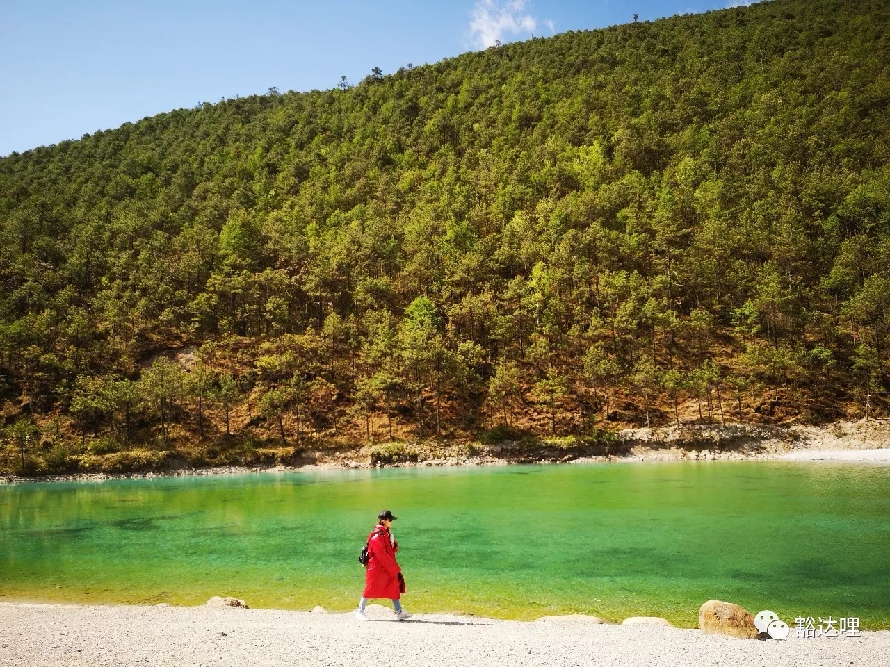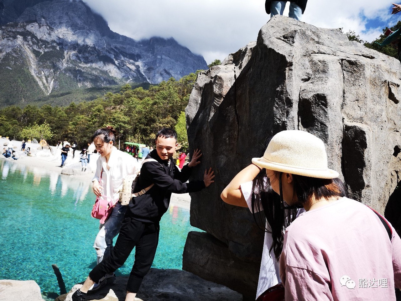 蓝月谷里所有的湖都清澈见底,蓝绿色的水下透出下面的石头,粗沙粒子,旁边有人工浅滩,我们便是站在浅滩边拍照留念,有块石头看到有小姐姐上去拍照好好看,后来又有小姐姐不慎站上去拍照滑下去,洗了个蓝月谷水澡,石头周围的水瞬间变成乳白色,因为石头粘水易滑倒,后来我们就放弃了那石头。