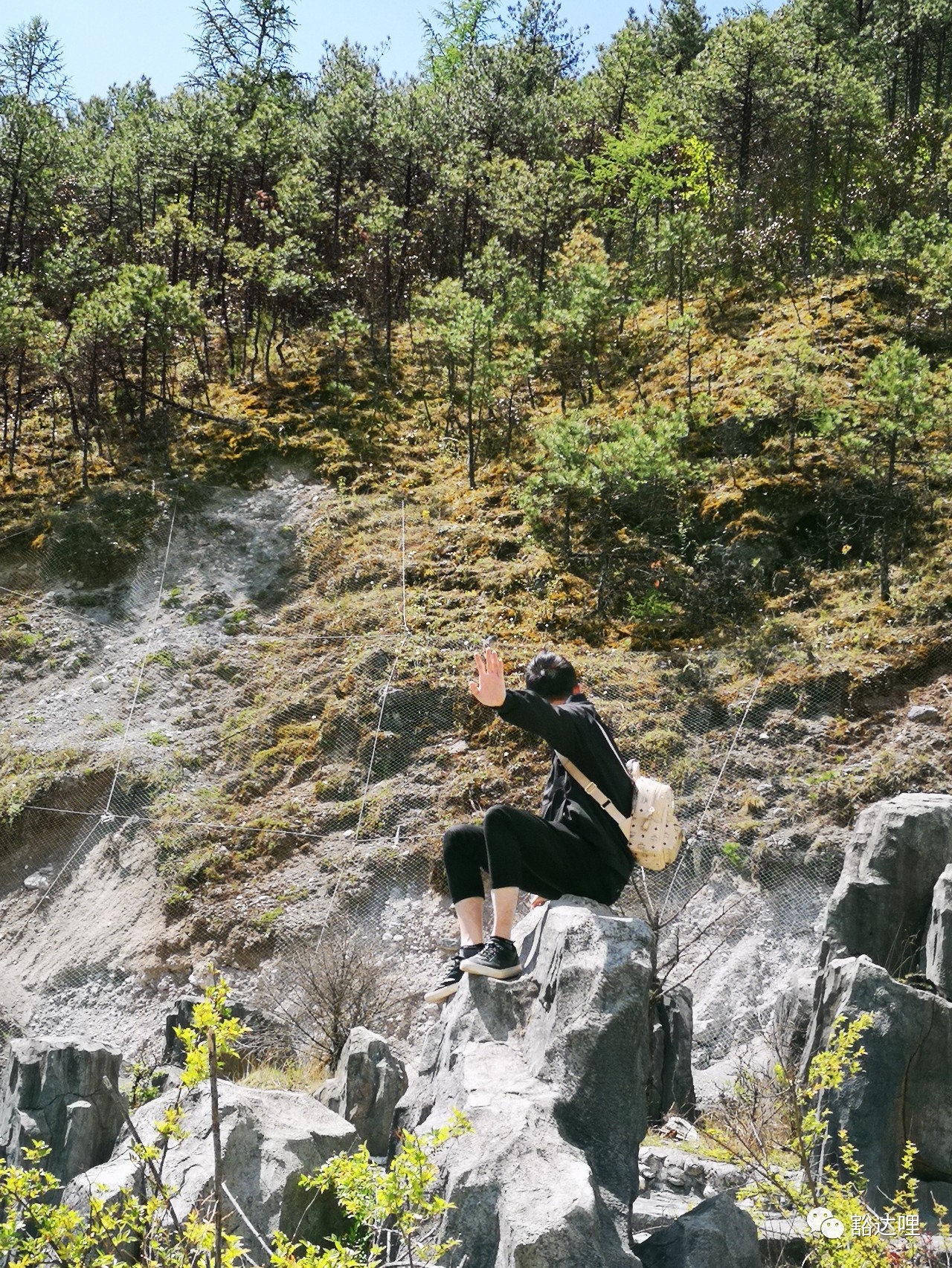朱跑在前面,去了一块怪石嶙峋的类似栅栏上孤独看着风景。因为大家都想找个好看且人少的地儿拍照,朱替我们选择了一块地儿,起初我是不愿意下去的,因为蹦蹦又跳跳,觉得害怕,不过有国家的力量替我们想办法,朱在前头一个个把女生接下来,罗在后面断尾,有块很大的空地,里面还有水,女生脚步子小,于是朱把旁边的时候挪到了水旁边,帮我们制造出一条新的路出来。