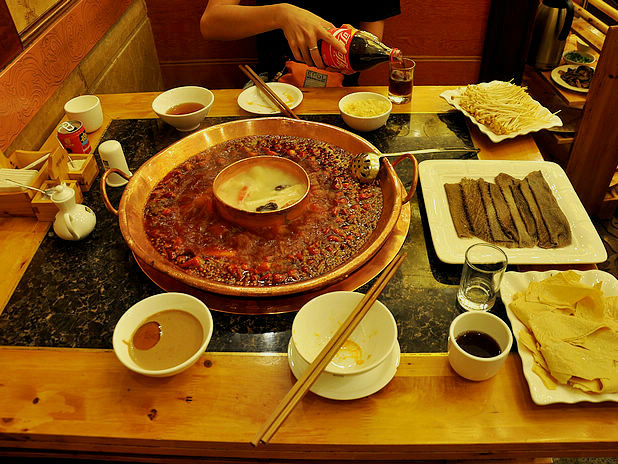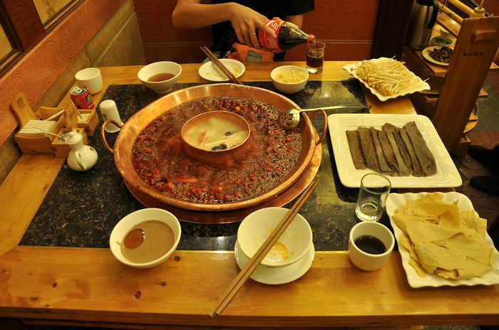 下图在/travel-scenic-spot/mafengwo/10035.html{成都} 的老码头吃了正宗的/travel-scenic-spot/mafengwo/12703.html{四川} 火锅,麻辣的确不一般,还是他请的