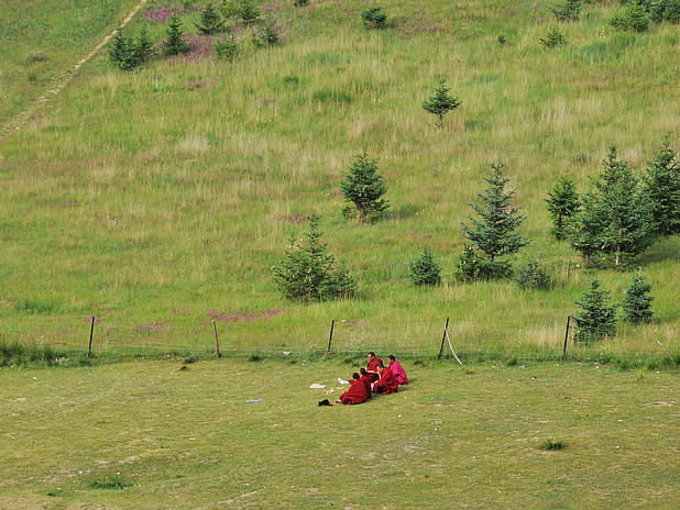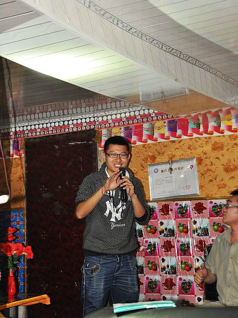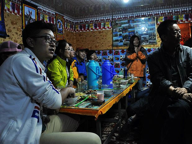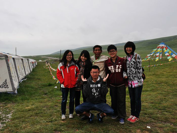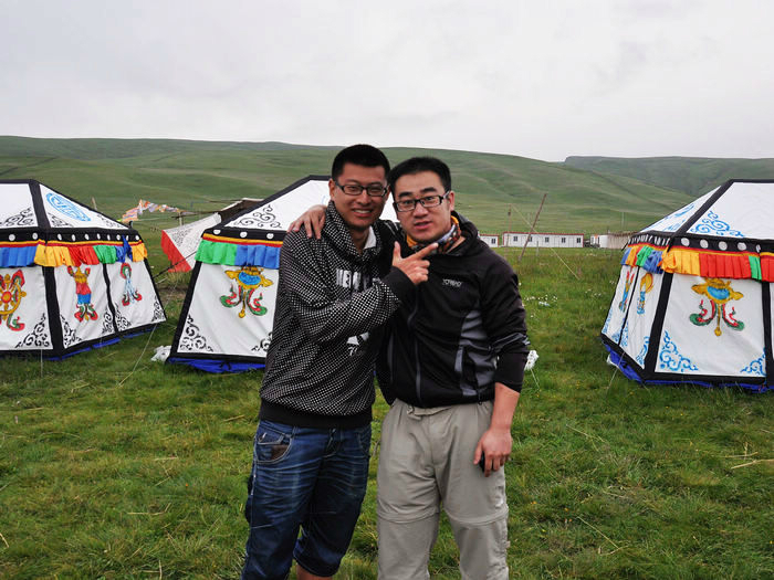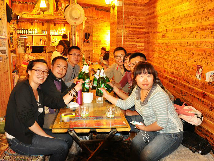 在郎木寺,我们从/poi/33275.html{拉卜楞寺(/poi/33275.html)} 包车自此,开心酒是少不了的,共饮此杯。先是我从/travel-scenic-spot/mafengwo/10800.html{西宁} 去/travel-scenic-spot/mafengwo/24828.html{夏河} 的班车上碰见/travel-scenic-spot/mafengwo/13366.html{汉中} 的代渡伦,据我观察,整车就我们两个是旅行的人,而且我们刚刚坐在一起,天意,之后便聊上了。/travel-scenic-spot/mafengwo/12059.html{镇江} 的小宝是在红石由代渡伦搭上的。之后来自/travel-scenic-spot/mafengwo/10195.html{西安} 的赵洁和王琼是经人指点,在卓/travel-scenic-spot/mafengwo/145841.html{玛家} 有包车信息,之后我们赶过去和他们一起商量着的。最后为了凑足七个人包辆小面包,赵洁和王琼便找上了他们宿舍的两个来自/travel-scenic-spot/mafengwo/10065.html{北京} 的崔玲和郭子丰。出来玩混熟的快是必须的。