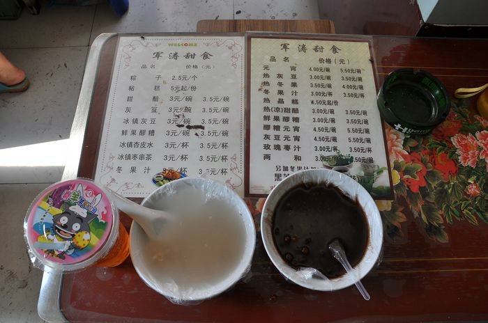 吃过杏皮水(下图左边,三块,正常的做法应该是杏子皮泡出来的,我觉得还蛮好喝的。后来在/travel-scenic-spot/mafengwo/10240.html{敦煌} 和/travel-scenic-spot/mafengwo/11340.html{张掖} 也喝过,味道比这边的浓),灰豆(下图右边,三块,和绿豆汤差不多,只不过里面的是豌豆),甜醅(下图中间,3块,燕/travel-scenic-spot/mafengwo/66378.html{麦加} 甜酒酿的感觉)