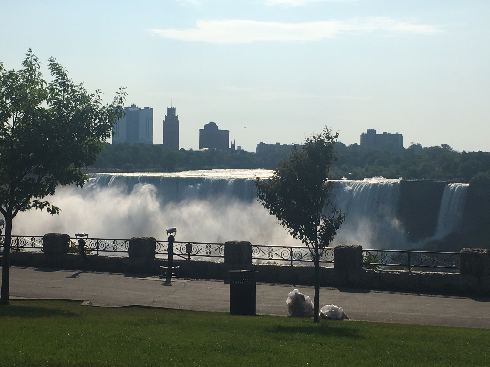 从图片可以看到有两个瀑布,近处的是在美国一侧的美国瀑布,这个瀑布相对较小。远处的就是马蹄形瀑布,非常壮观。