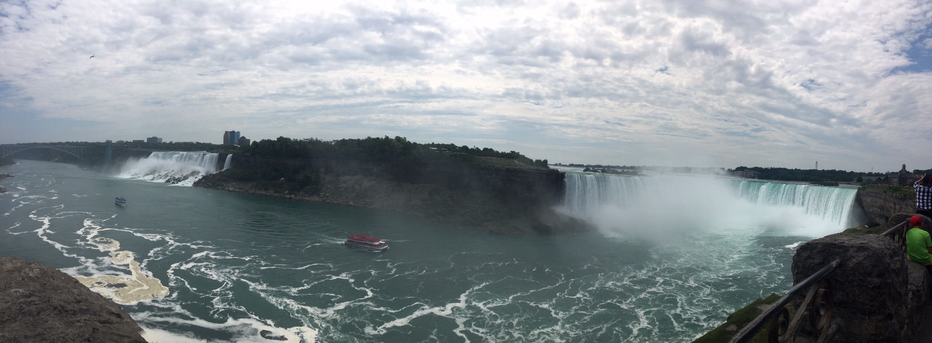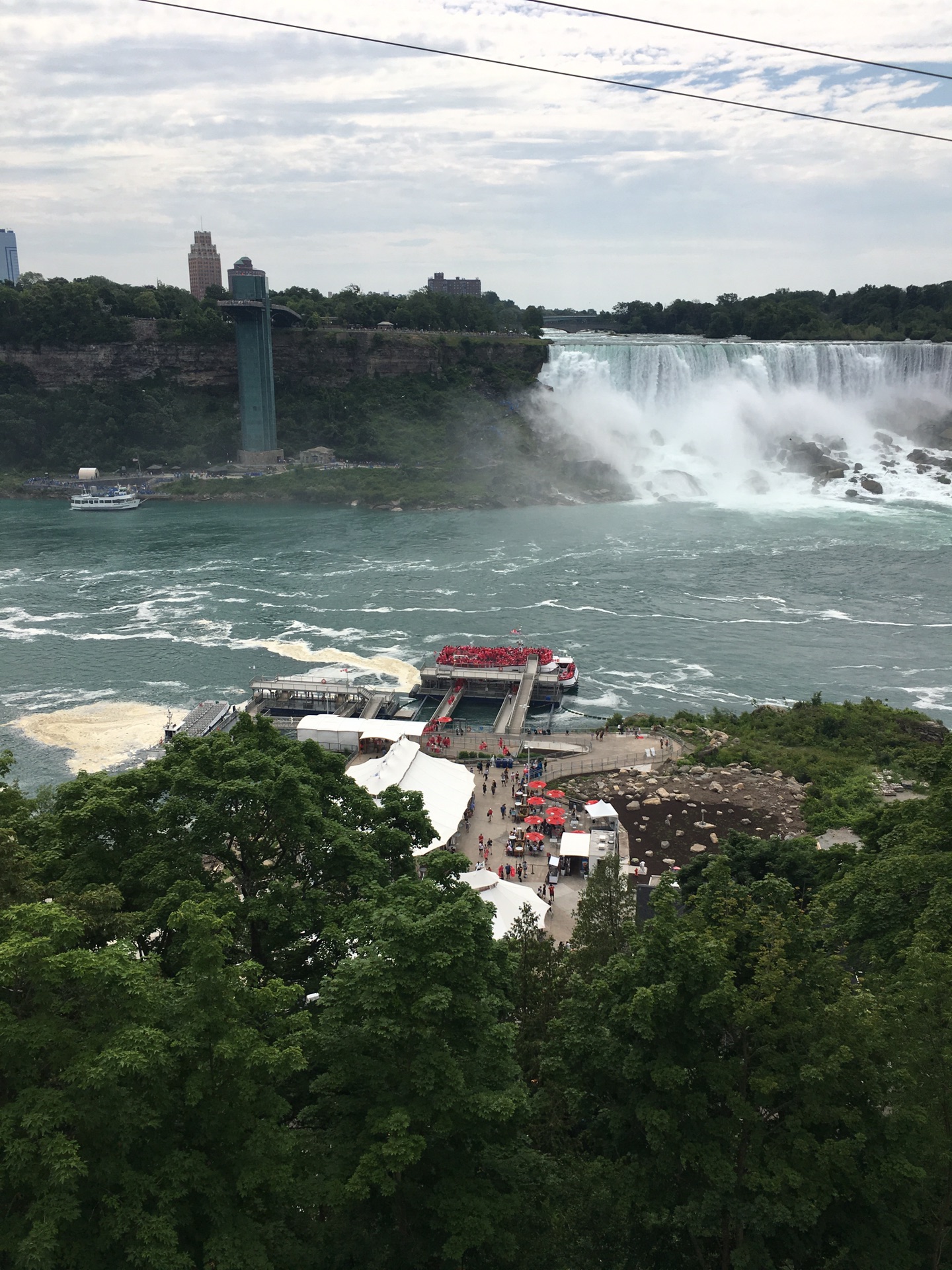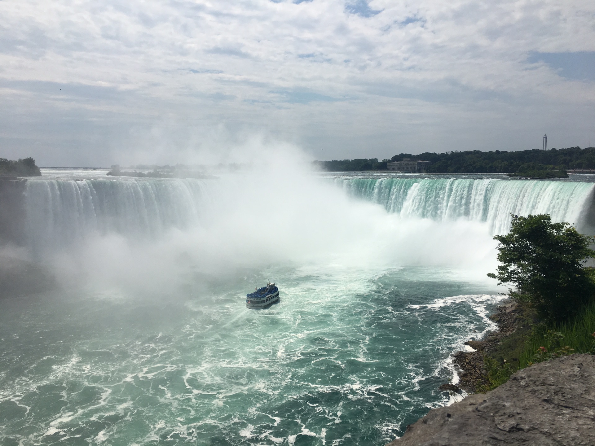 景点第一站当然是非常著名的尼亚加拉大瀑布!我是开车过去的(景点当地的停车费真的好贵,一小时10加元,相当于一小时50元人民币,人工收费停车场很少,路边都是咪表,需要信用卡收费),当然也有巴士到达。大瀑布的产生是因为美国境内的伊利湖在美加边境的地方突然出现巨大的海拔落差所形成的,所以最壮观的马蹄形瀑布分属美加两国,从观赏角度来看,加拿大一侧更漂亮和壮观
