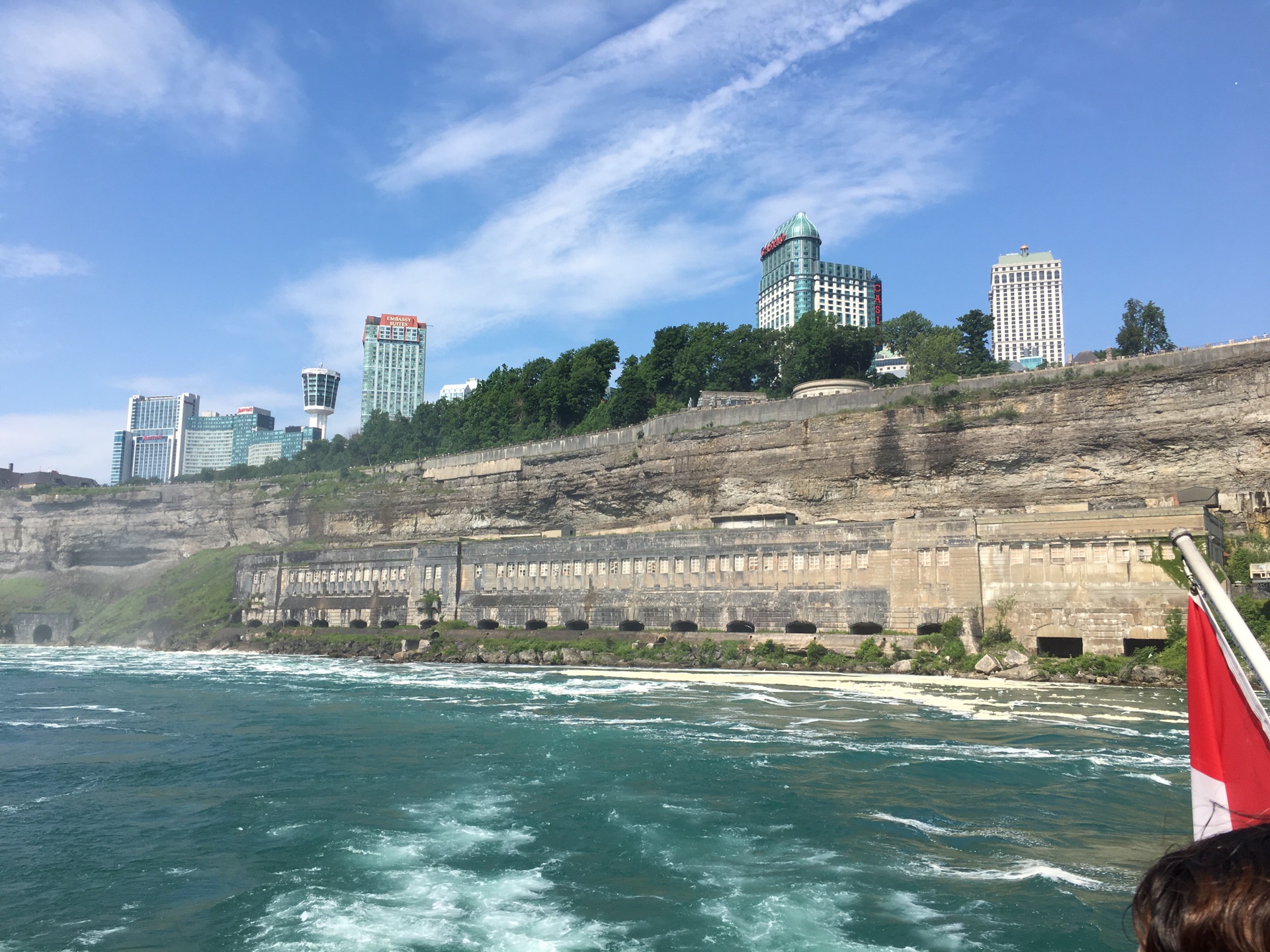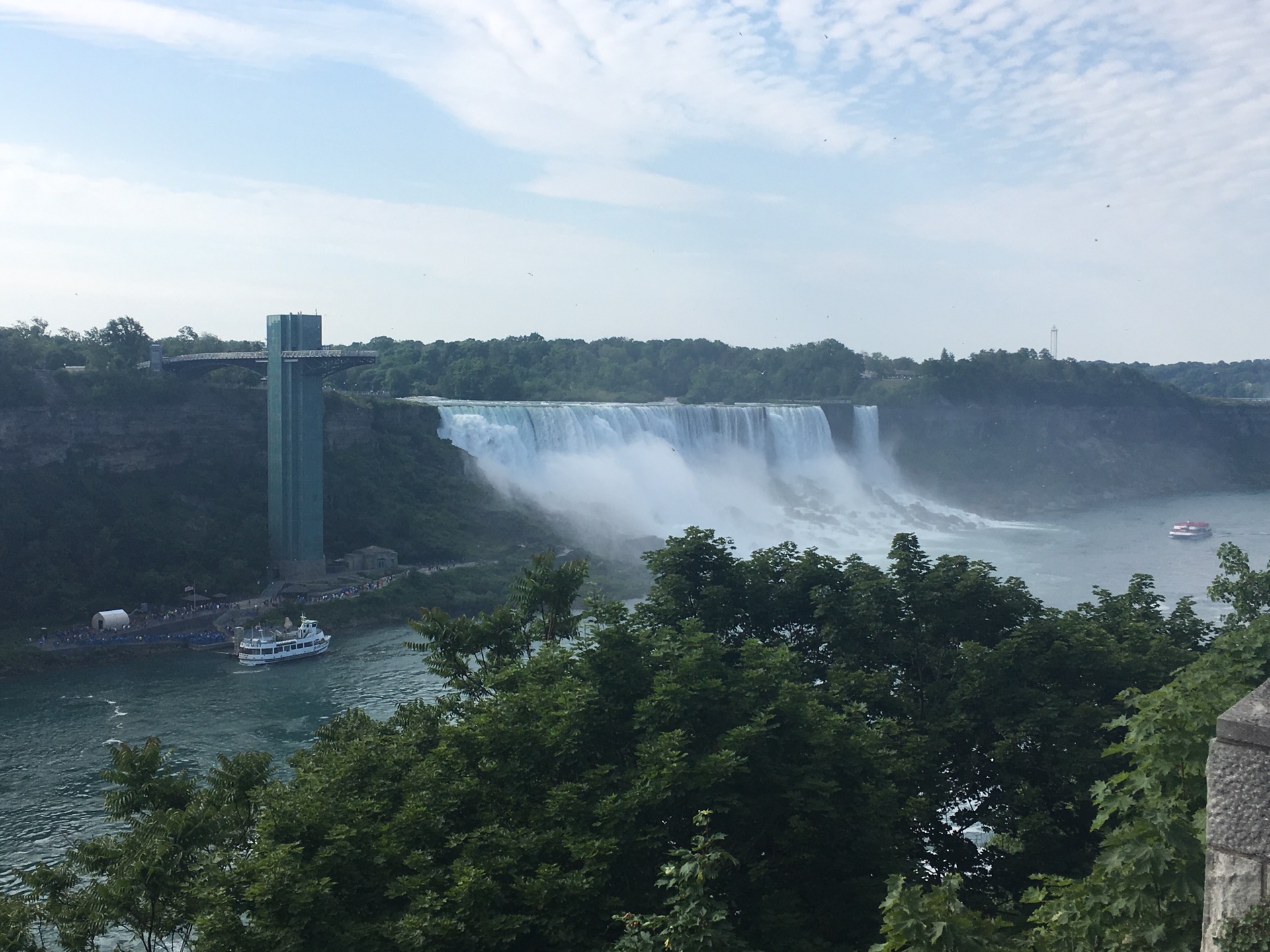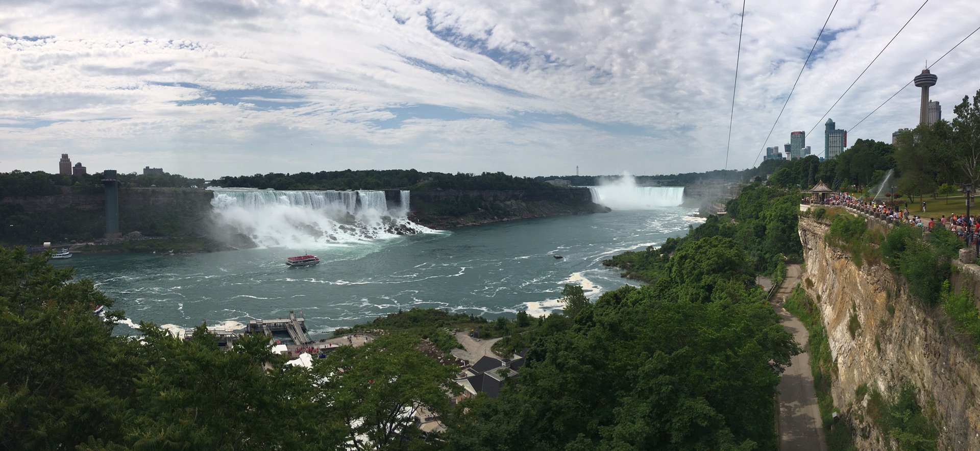 景点第一站当然是非常著名的尼亚加拉大瀑布!我是开车过去的(景点当地的停车费真的好贵,一小时10加元,相当于一小时50元人民币,人工收费停车场很少,路边都是咪表,需要信用卡收费),当然也有巴士到达。大瀑布的产生是因为美国境内的伊利湖在美加边境的地方突然出现巨大的海拔落差所形成的,所以最壮观的马蹄形瀑布分属美加两国,从观赏角度来看,加拿大一侧更漂亮和壮观