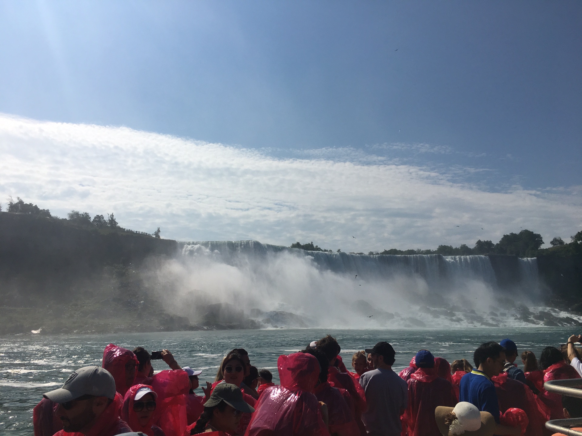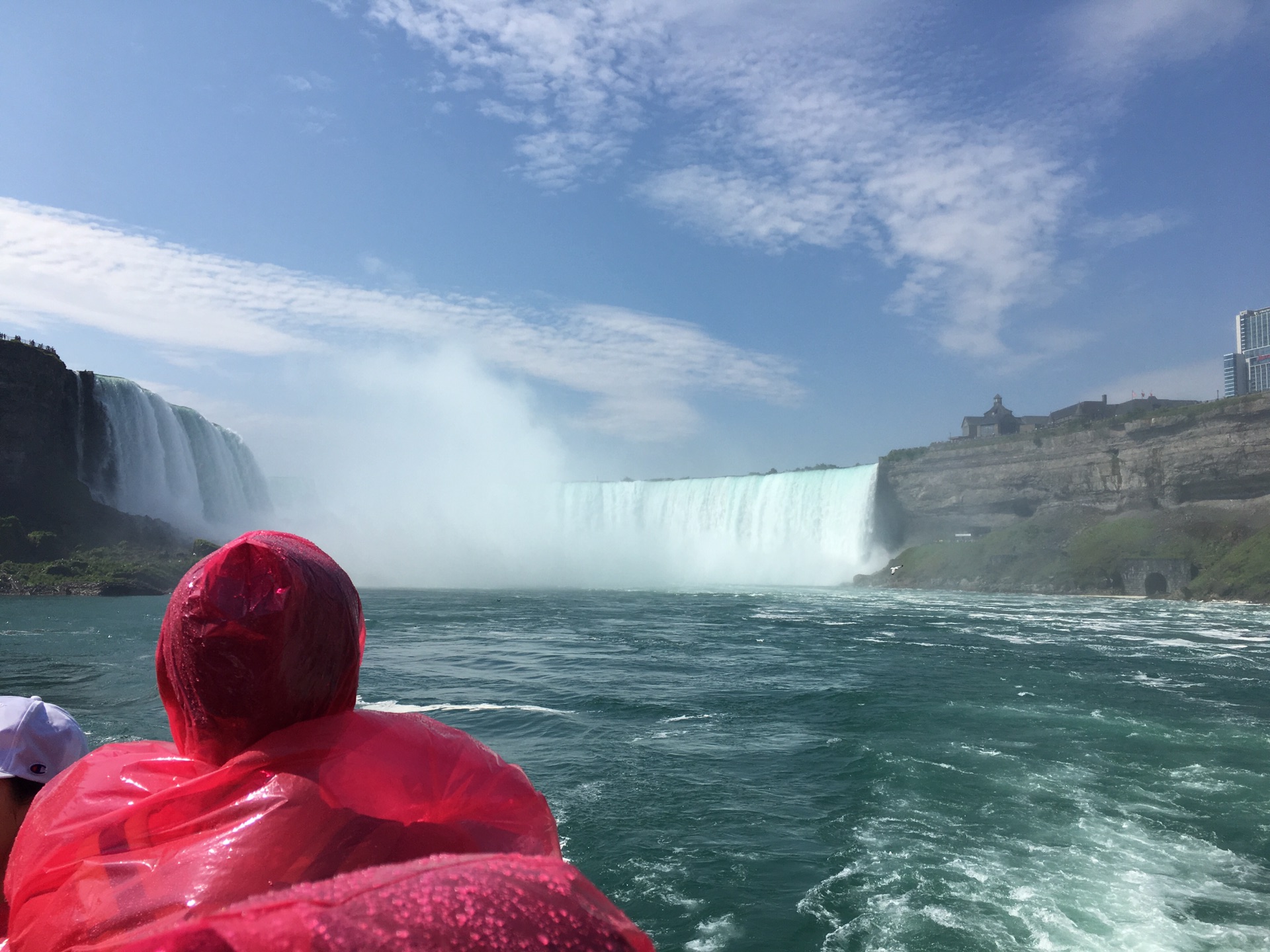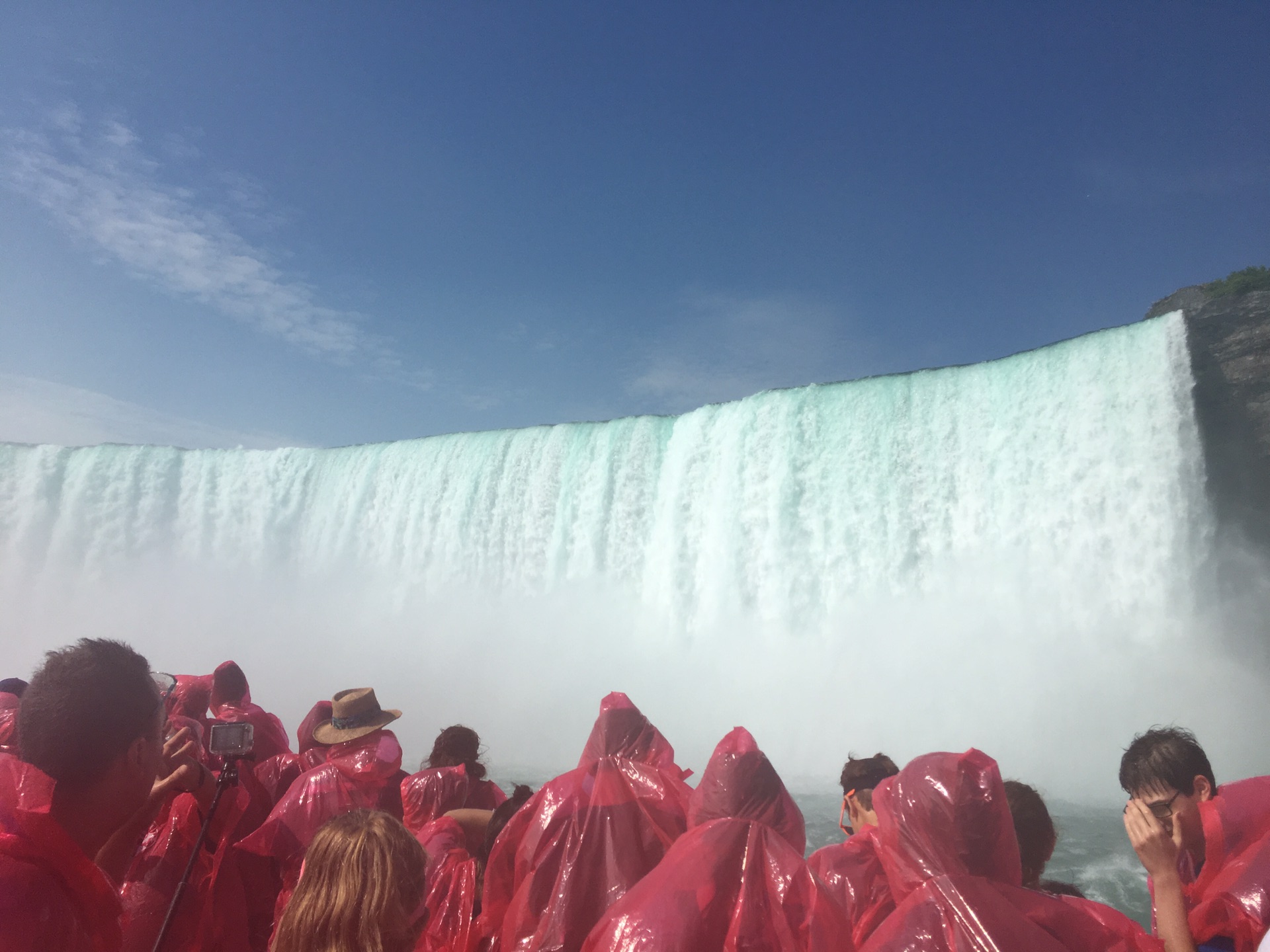 每个上船的游客都会发一件红色雨衣,美国一侧是发蓝色的,不过水非常大,最后头还是会像落汤鸡