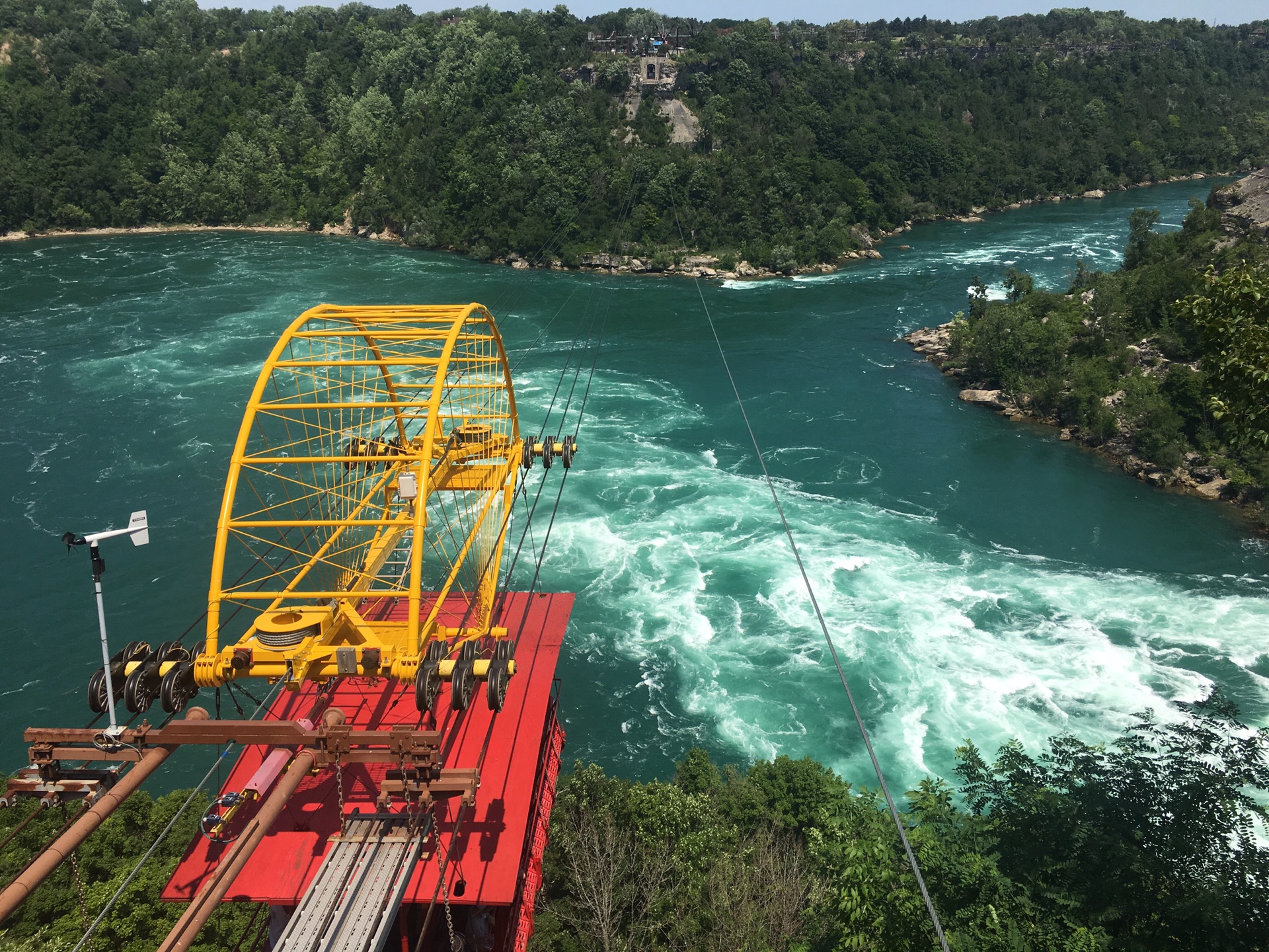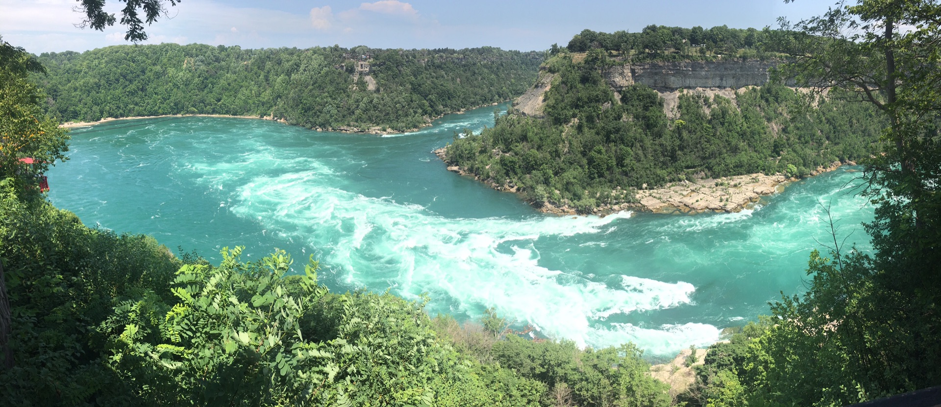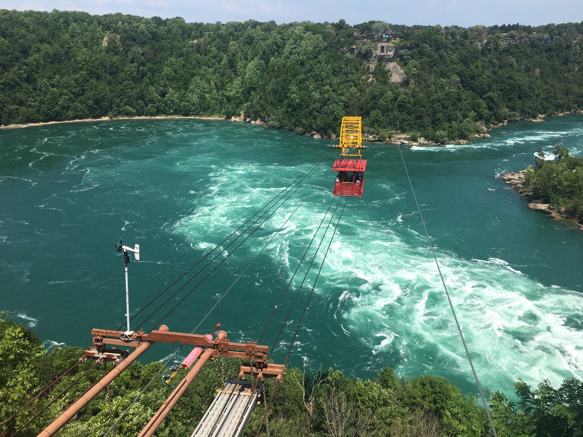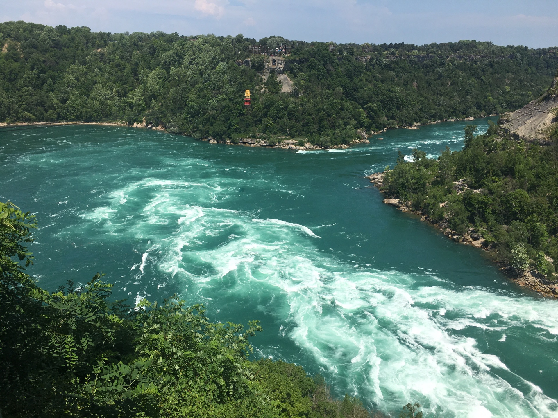 湖水随着尼亚加拉河来到一个叫Whirlpool Aero Car的地方,这里离瀑布下游约4公里。尼亚加拉河在这里近90度的转折。由于上游流水力量较大,冲击岸边的回流水流与上游来水形成了各种漩涡。你可以搭乘空中缆车观看河中的漩涡,也可以选在在岸边看看