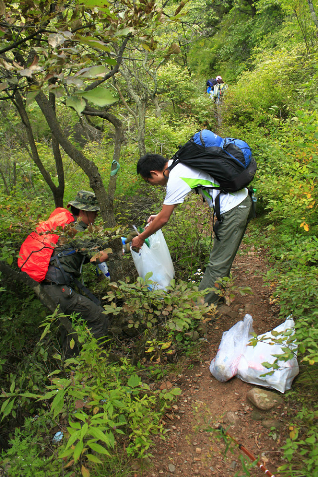 此后1年多的时间,我去了海坨各种路线,共计7次,西大上、大海坨村下;西大上、小海坨、大海坨返回西大;西大上,啤酒溪下等等,在海坨上看到过云海的惊艳,遇到过大雨,以致手台、手机、相机全成“水货”、全身上下湿透,每一次都实现了自我超越,每一次都登上2198.388标志碑的小海坨。去年曾组织5人小队海坨捡拾白色垃圾。今年休闲活动较多,517上看到海坨在修路,可能很快就成为景区了,果断决定组织环保小队,在海坨成为景区前,再次去捡拾白色垃圾。