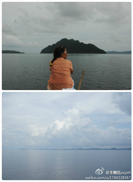 Guido爷爷终于回来了,一行人艰难的开出海(红树林附近像沼泽一样,基本上船是Guido推出去的)。一路上海 天一色,Guido的妻子就坐在船头,想来她平时应该常有机会这样坐在海天之间,欣赏这美丽的地球吧。