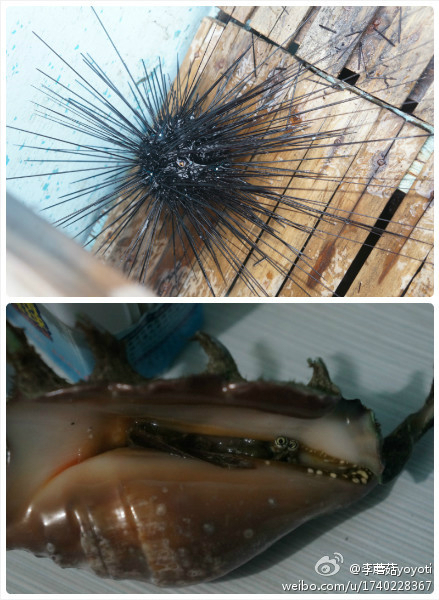 生吃了海胆(大家都说不错,但不是我能接受的味道),还抓到一只好有个性的海螺,身上所有的部位都紧紧的收进去,只有眼睛一直长长的探出来,努力张望,哈哈,也太可爱了吧!!